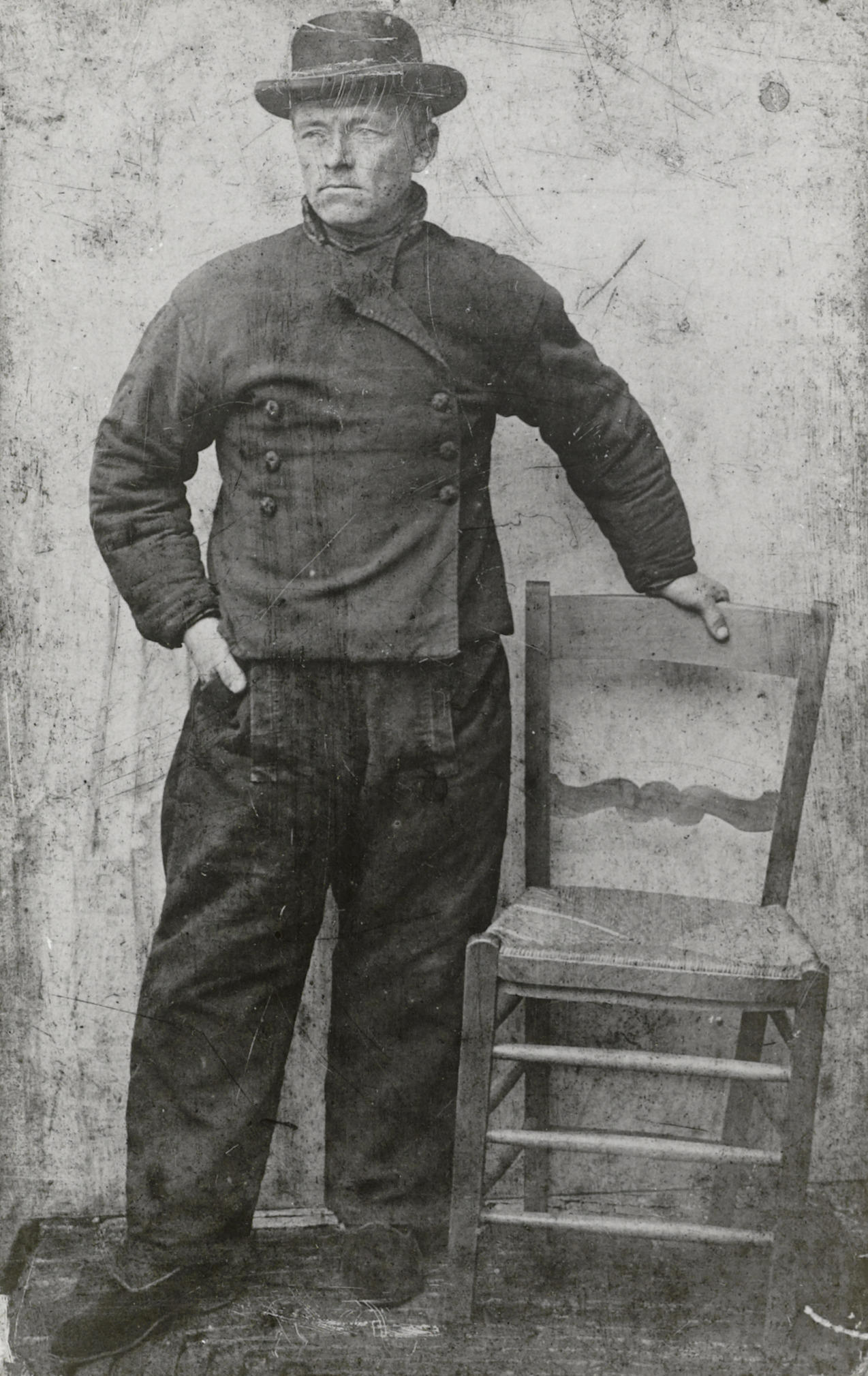 Visser in streekdracht uit Spakenburg, circa 1860 (zwart-wit foto)