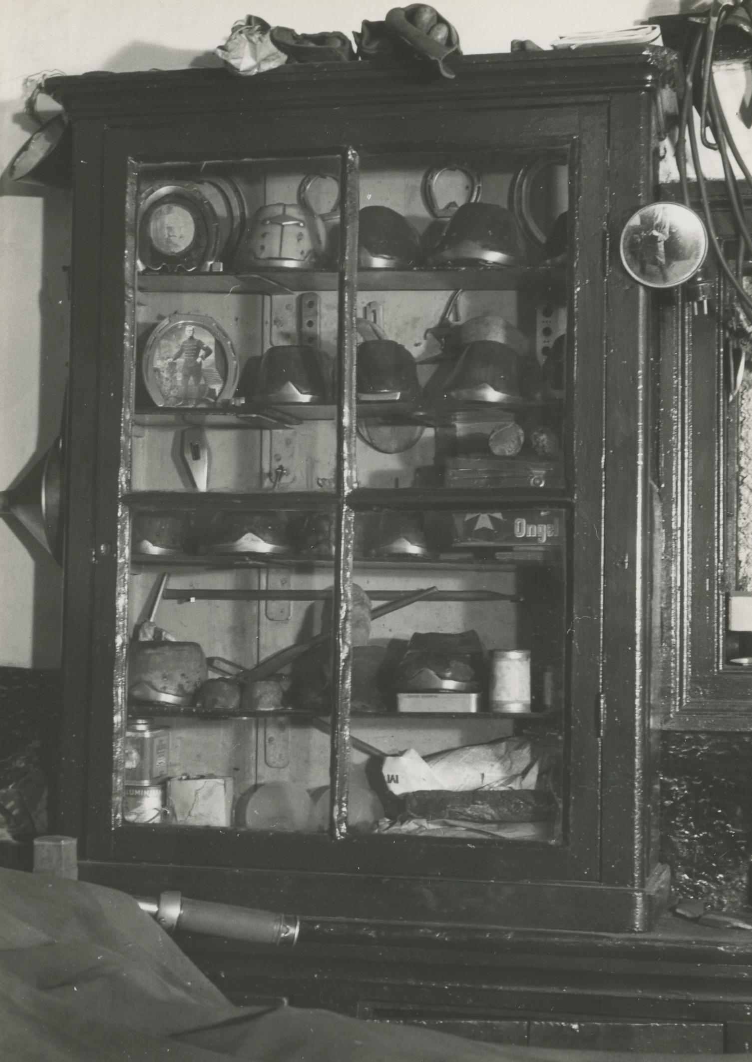 Kastje met voorbeelden van hoefijzers, in het interieur van de hoefsmederij van Th. A. Poppe aan de Luttekestraat in Zwolle.