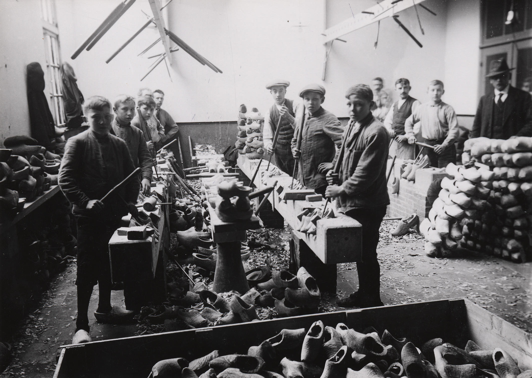 Jongens poseren met hun gereedschap in het interieur van een klompenmakerij.