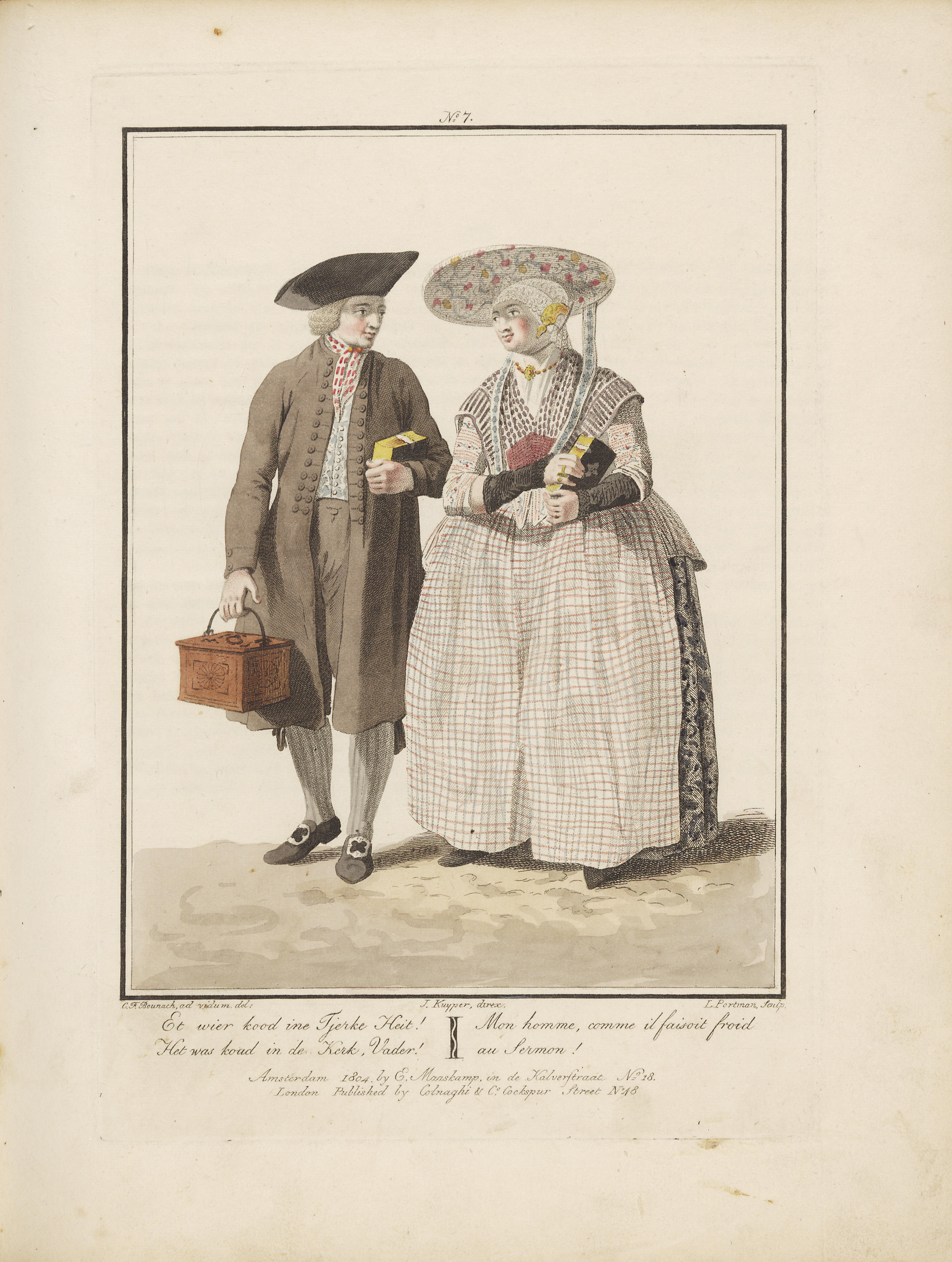 Ingekleurde gravure; Plaat 7 uit: Afbeeldingen van de kleeding, zeden en gewoonten in de bataafsche republiek, met den aanvang der negentiende eeuw = Tableaux de l'habillement, des ... / door E. Maaskamp. - Amsterdam : E. Maaskamp, 1803. In 1829 heeft Maaskamp de prenten opnieuw uitgegeven. In details en inkleuring zijn ze soms aangepast.