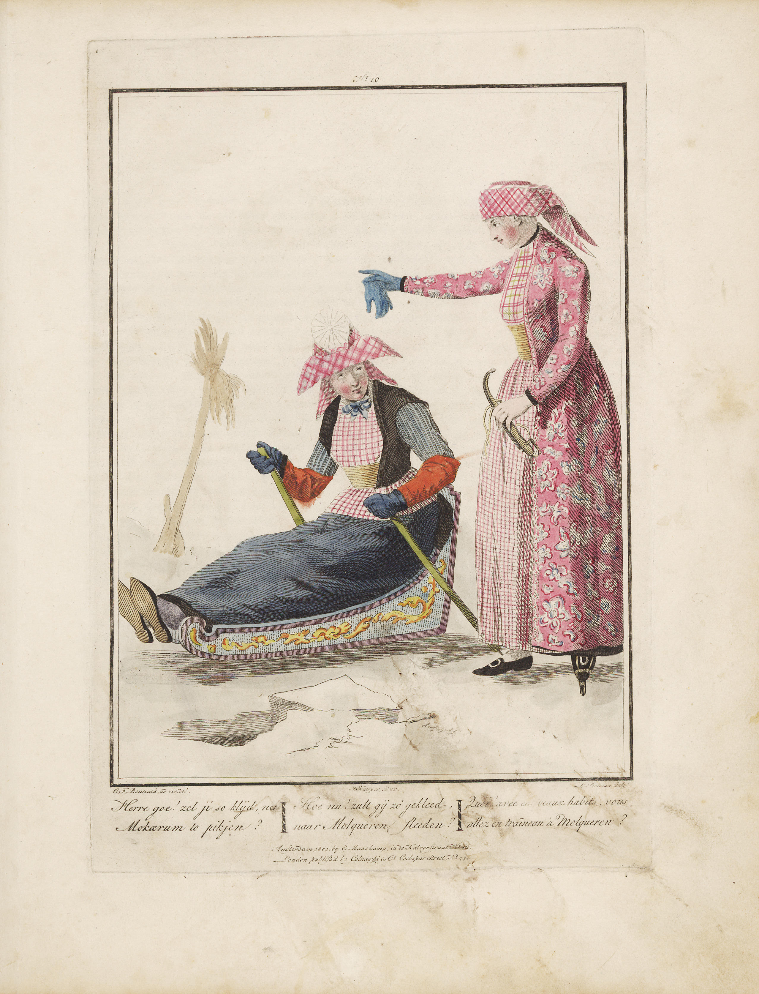 Ingekleurde gravure; Plaat 10 uit: Afbeeldingen van de kleeding, zeden en gewoonten in de bataafsche republiek, met den aanvang der negentiende eeuw = Tableaux de l'habillement, des ... / door E. Maaskamp. - Amsterdam : E. Maaskamp, 1803. In 1829 heeft Maaskamp de prenten opnieuw uitgegeven. In details en inkleuring zijn ze soms aangepast.
