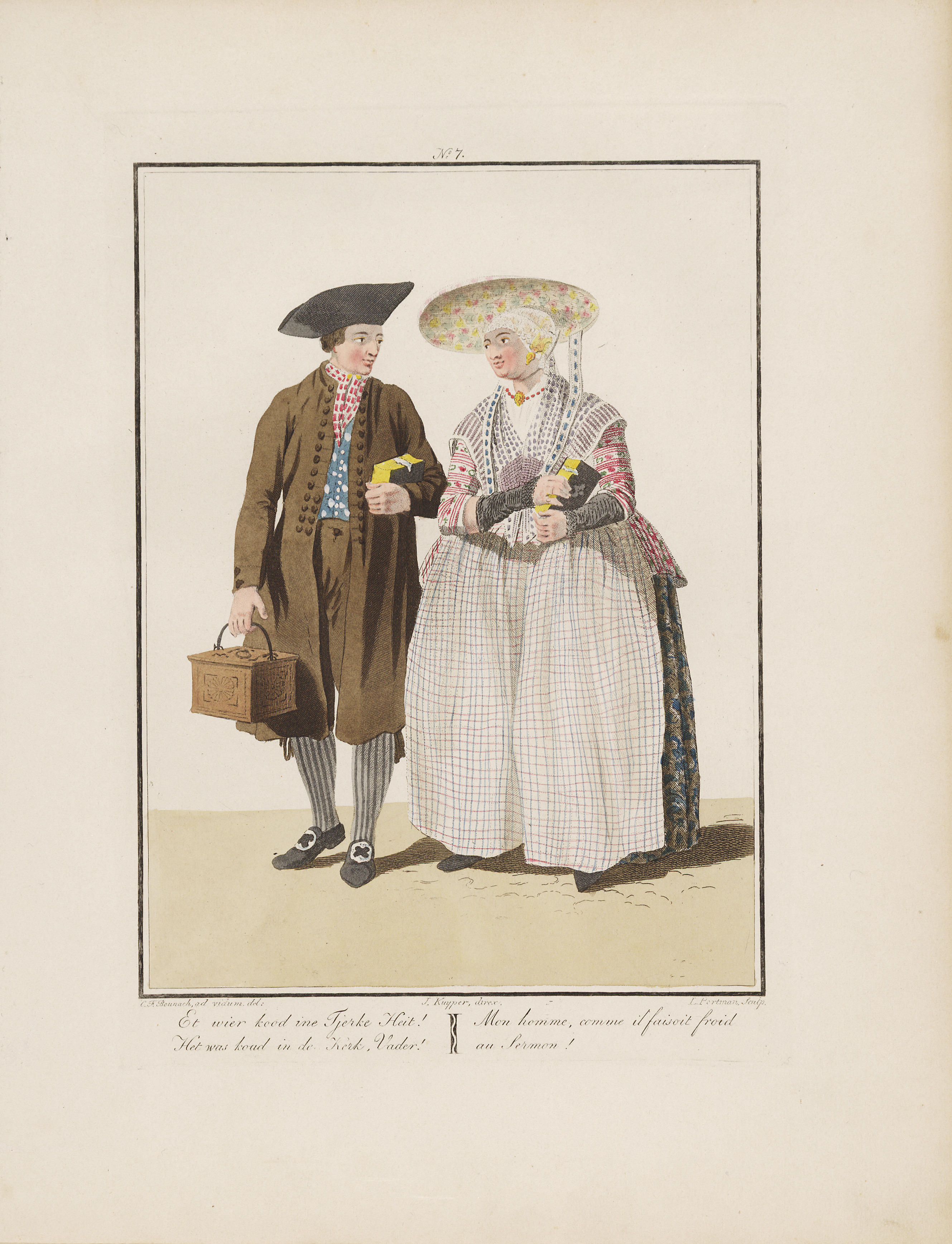 Ingekleurde gravure; Plaat 7 uit: Afbeeldingen van de kleedingen, zeden en gewoonten in de noordelijke provincien van het Koninkrijk der Nederlanden : met den aanvang der negentiende eeuw = Tableaux des habillemens ... / E. Maaskamp - Amsterdam, E. Maaskamp, 1829. De platen zijn eerder in 1803 door Maaskamp uitgegeven. In details en inkleuring zijn ...