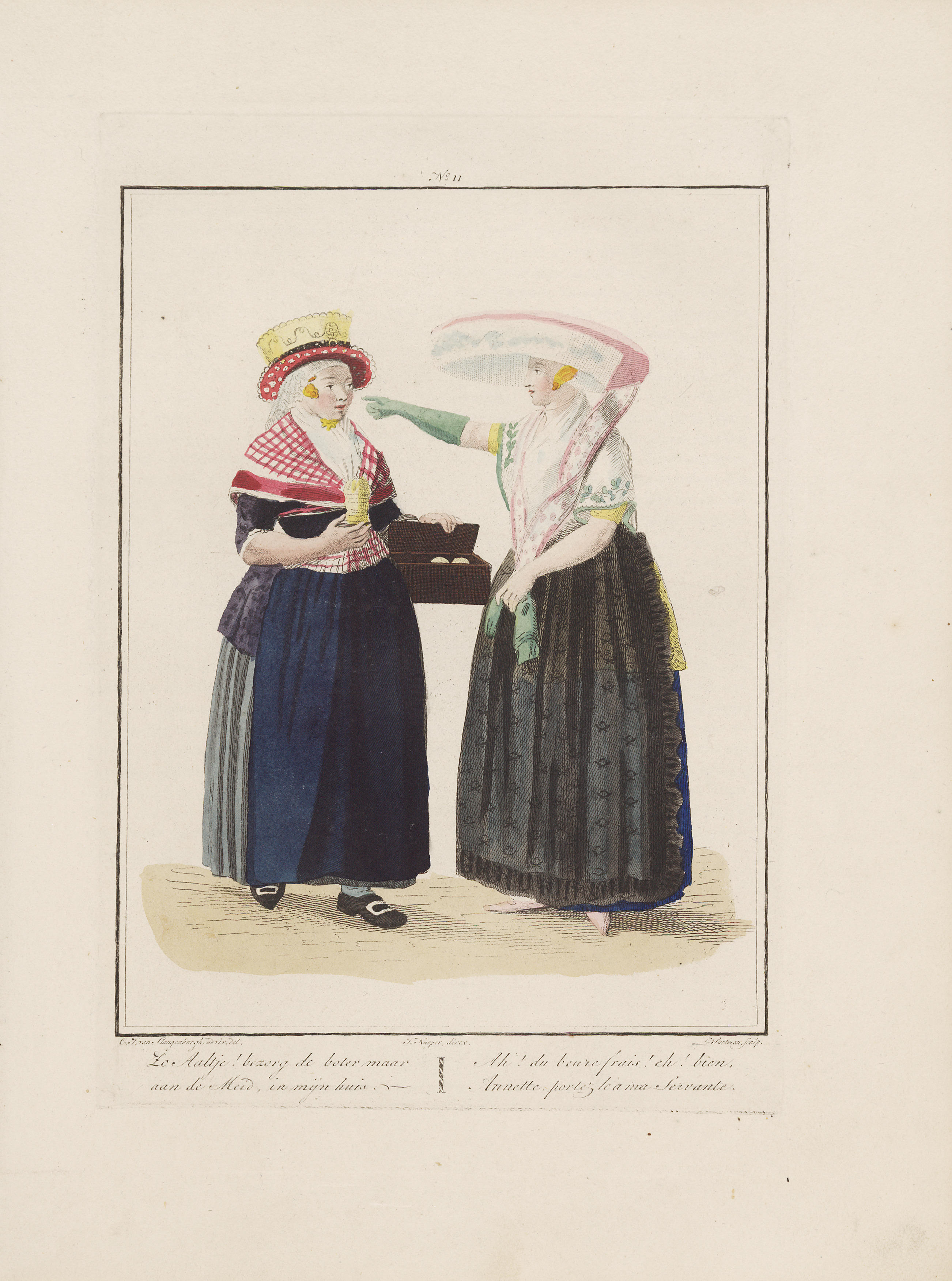 Ingekleurde gravure; Plaat 11 uit: Afbeeldingen van de kleedingen, zeden en gewoonten in de noordelijke provincien van het Koninkrijk der Nederlanden : met den aanvang der negentiende eeuw = Tableaux des habillemens ... / E. Maaskamp - Amsterdam, E. Maaskamp, 1829. De platen zijn eerder in 1803 door Maaskamp uitgegeven. In details en inkleuring zijn ...