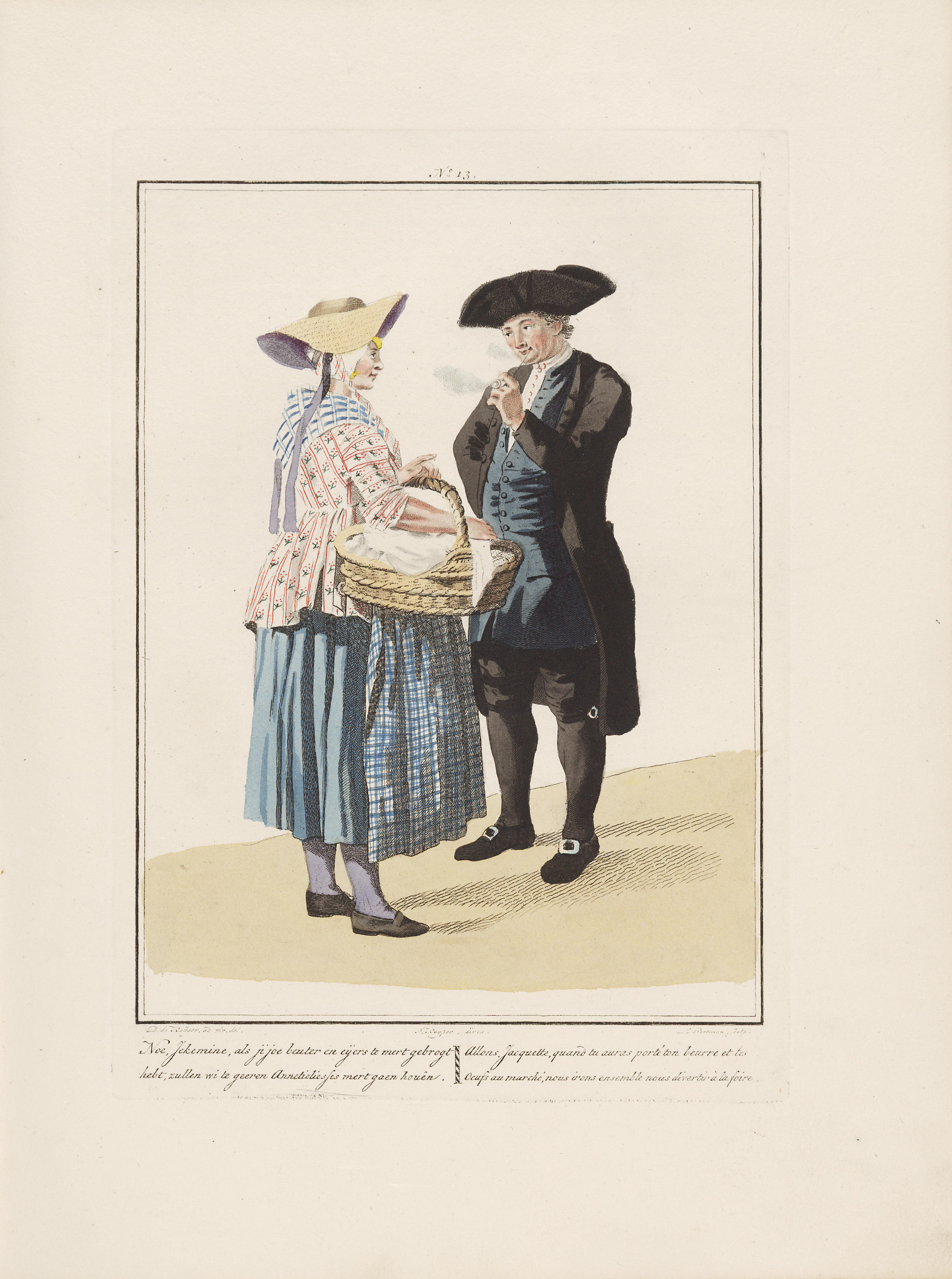 Ingekleurde gravure; Plaat 13 uit: Afbeeldingen van de kleedingen, zeden en gewoonten in de noordelijke provincien van het Koninkrijk der Nederlanden : met den aanvang der negentiende eeuw = Tableaux des habillemens ... / E. Maaskamp - Amsterdam, E. Maaskamp, 1829. De platen zijn eerder in 1803 door Maaskamp uitgegeven. In details en inkleuring zijn ...