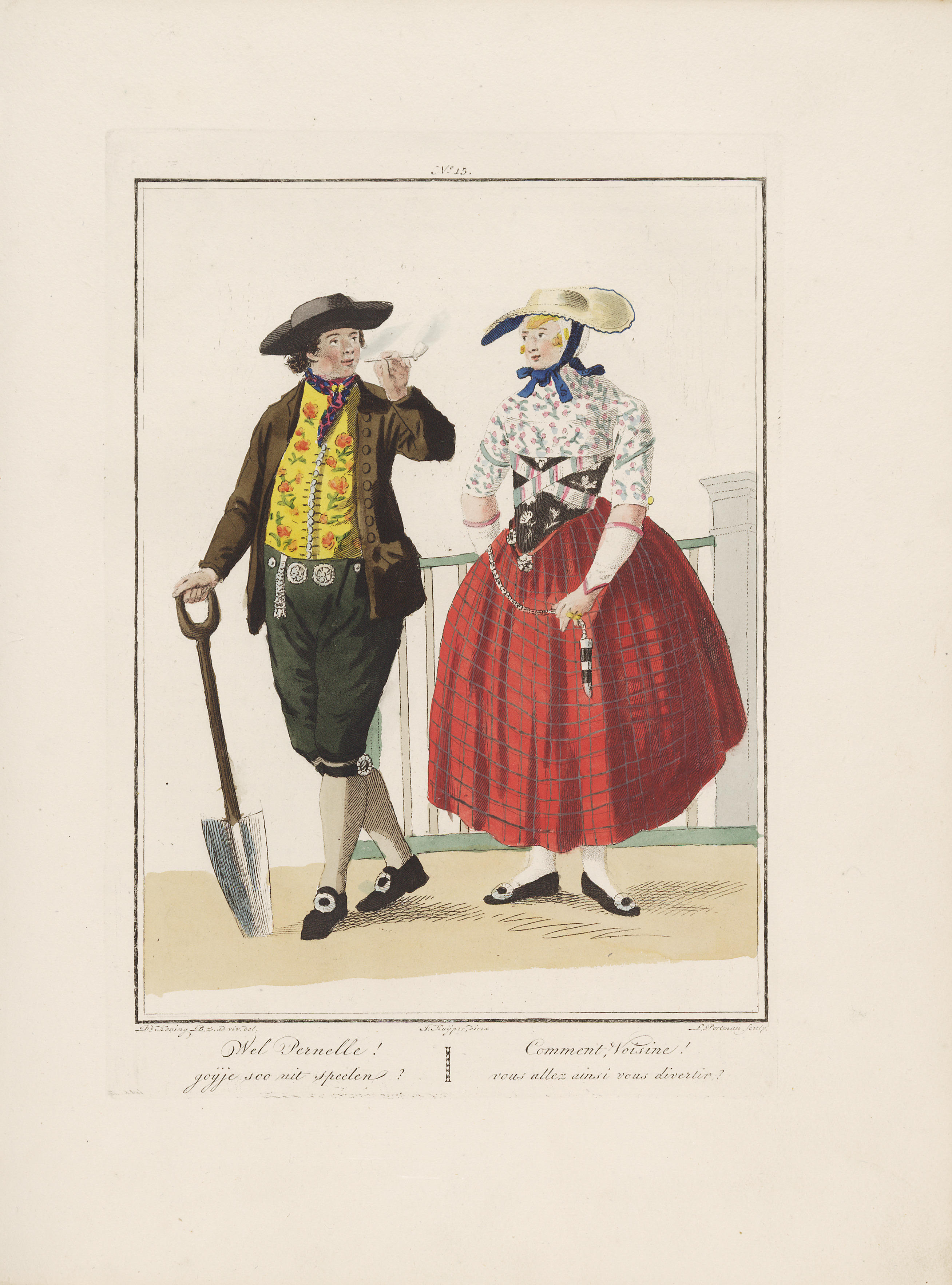 Ingekleurde gravure; Plaat 15 uit: Afbeeldingen van de kleedingen, zeden en gewoonten in de noordelijke provincien van het Koninkrijk der Nederlanden : met den aanvang der negentiende eeuw = Tableaux des habillemens ... / E. Maaskamp - Amsterdam, E. Maaskamp, 1829. De platen zijn eerder in 1803 door Maaskamp uitgegeven. In details en inkleuring zijn ...