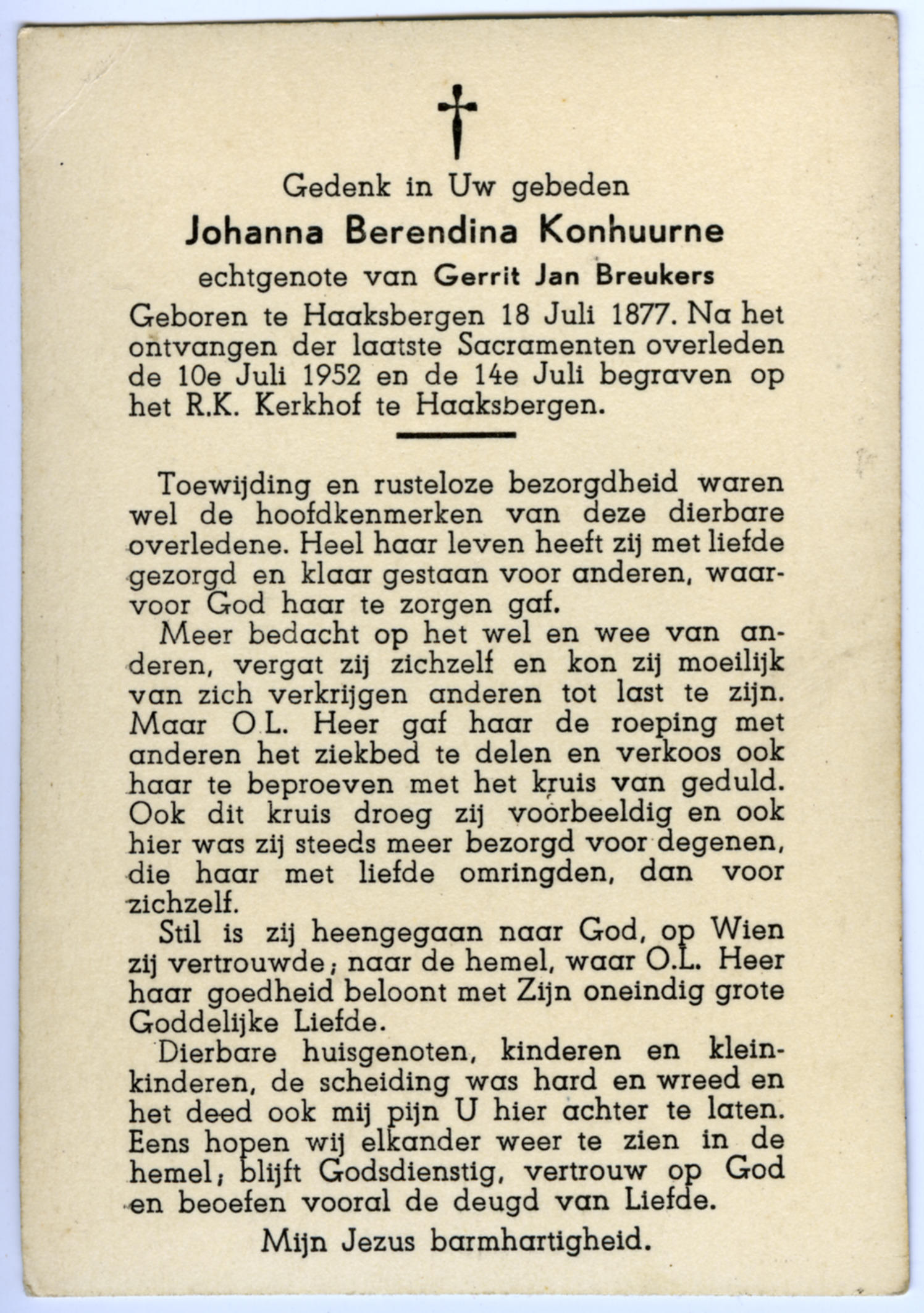 Bidprentje van Johanna Berendina Konhuurne, 1952 (bidprentje)