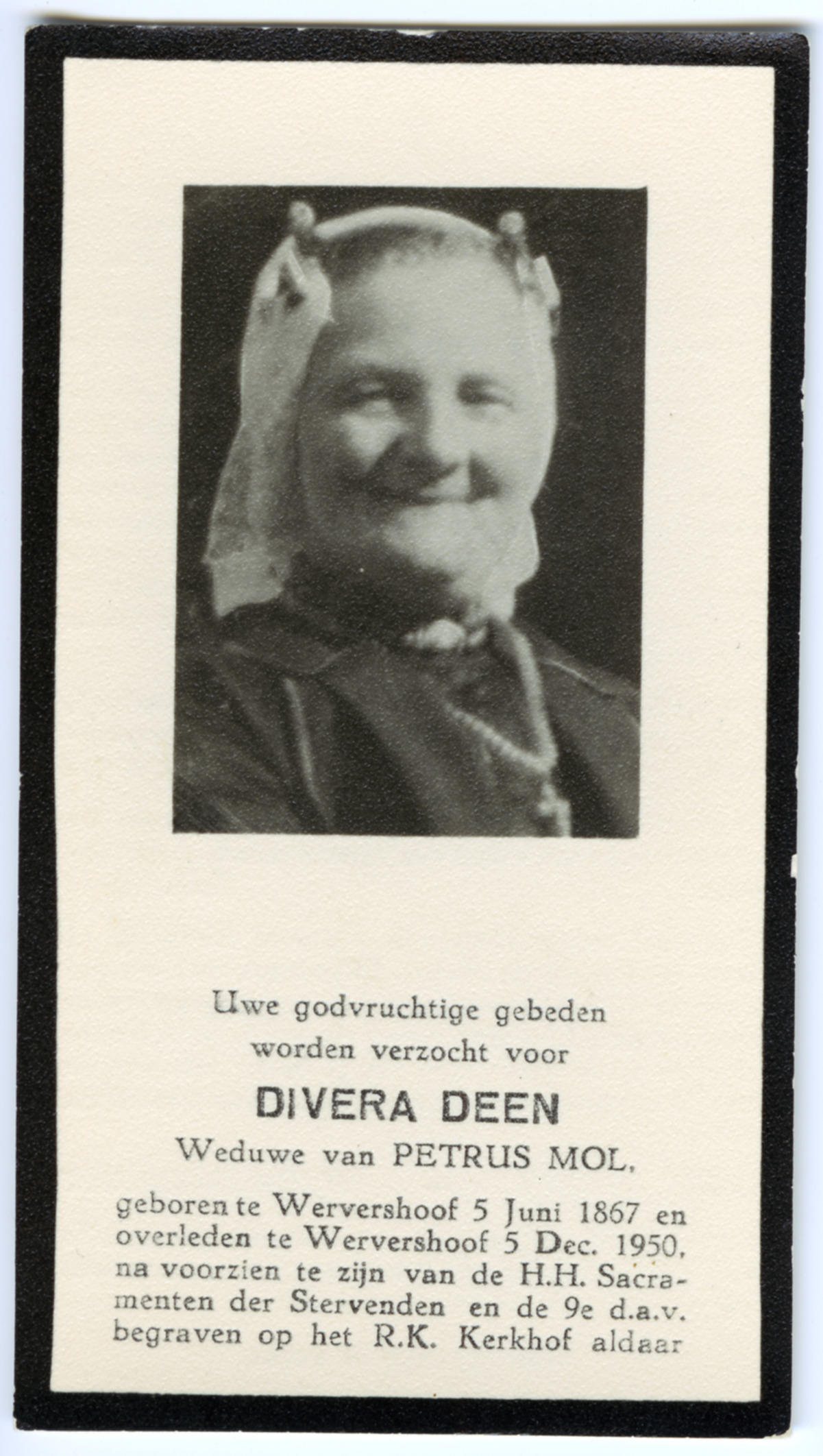 Bidprentje ter gedachtenis aan Divera Mol-Deen, geboren in Wervershoof op 5 juni 1867 en daar overleden op 5 december 1950. Divera is gekleed in West-Friese streekdracht.
