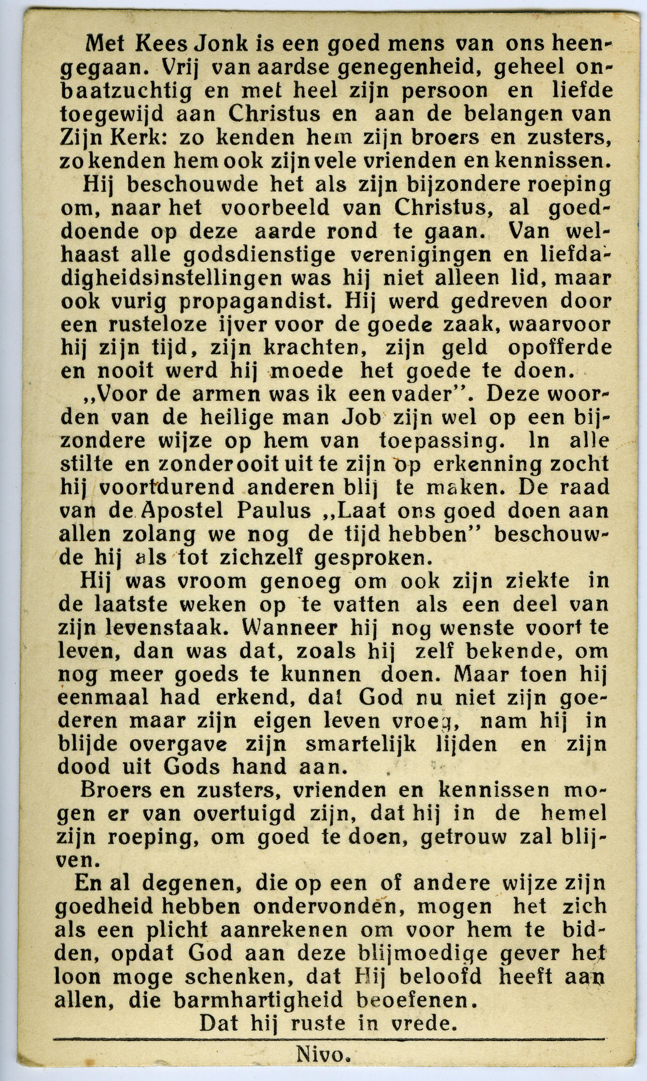 Bidprentje van Cornelis Jonk, 1952 (bidprentje)