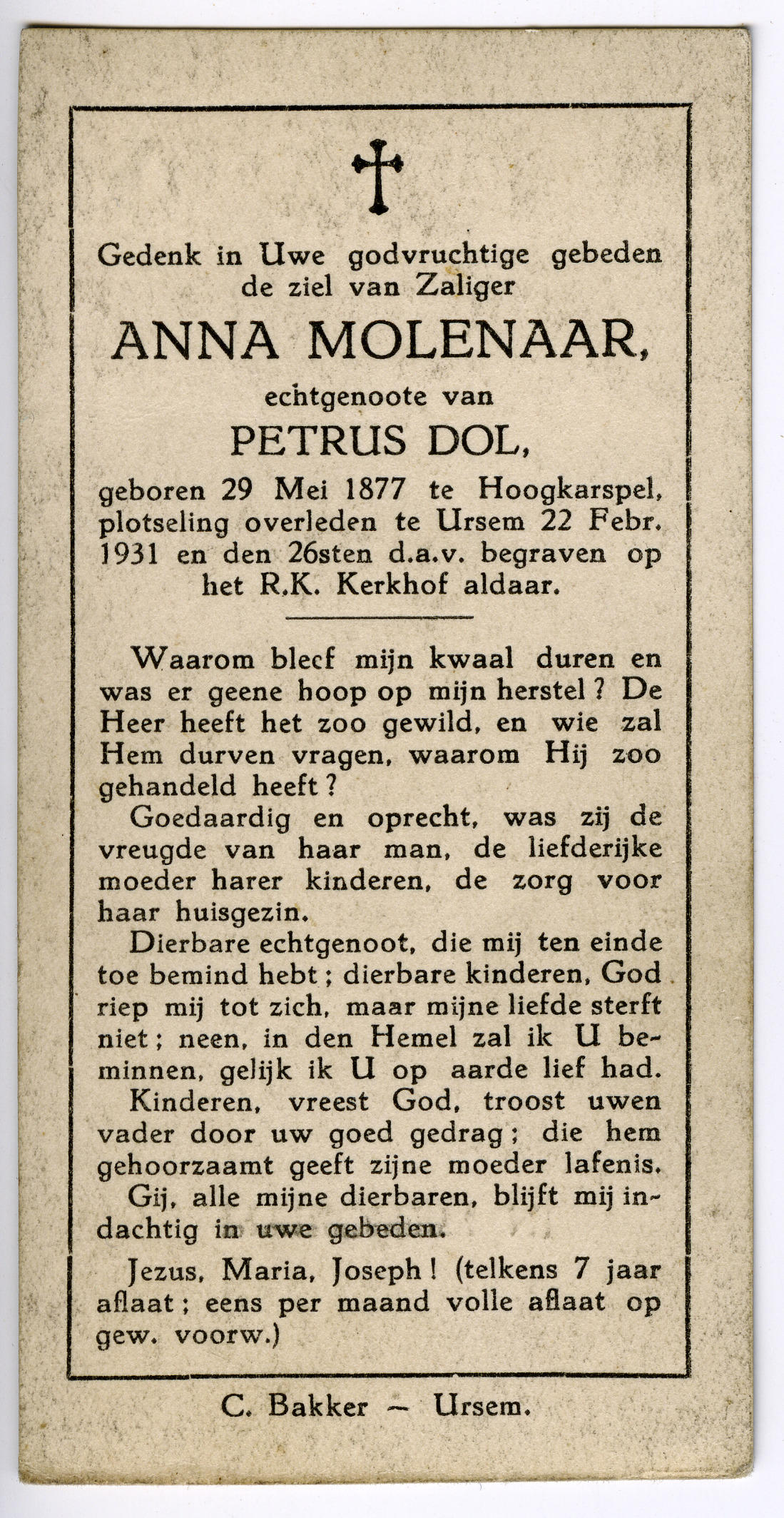 Bidprentje van Anna Molenaar, 1931 (bidprentje)