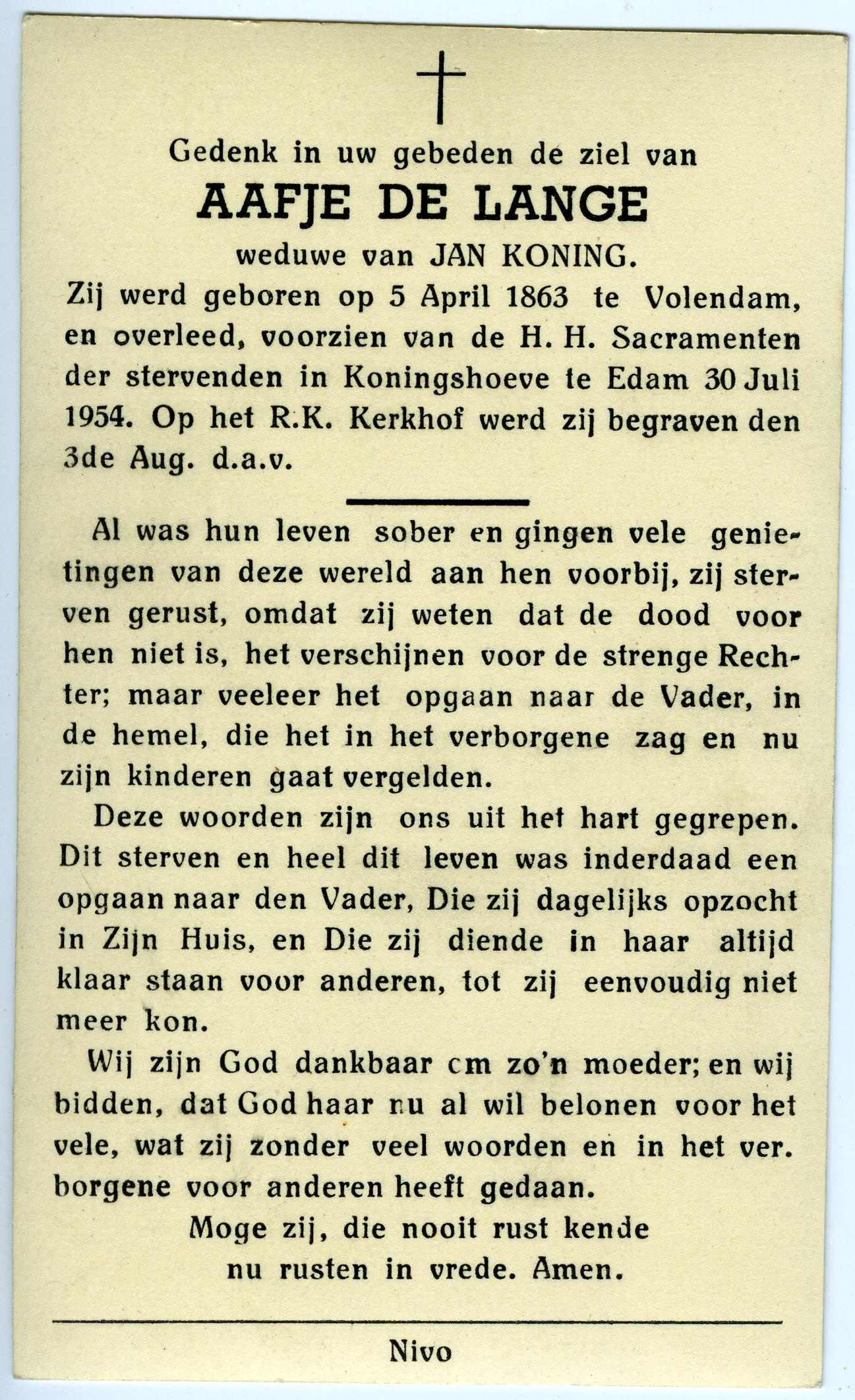 Bidprentje ter gedachtenis aan Aafje Koning-de Lange, geboren op 5 april 1863 in Volendam en overleden op 30 juli 1954 in Edam. Aafje is gekleed in Volendammer streekdracht.