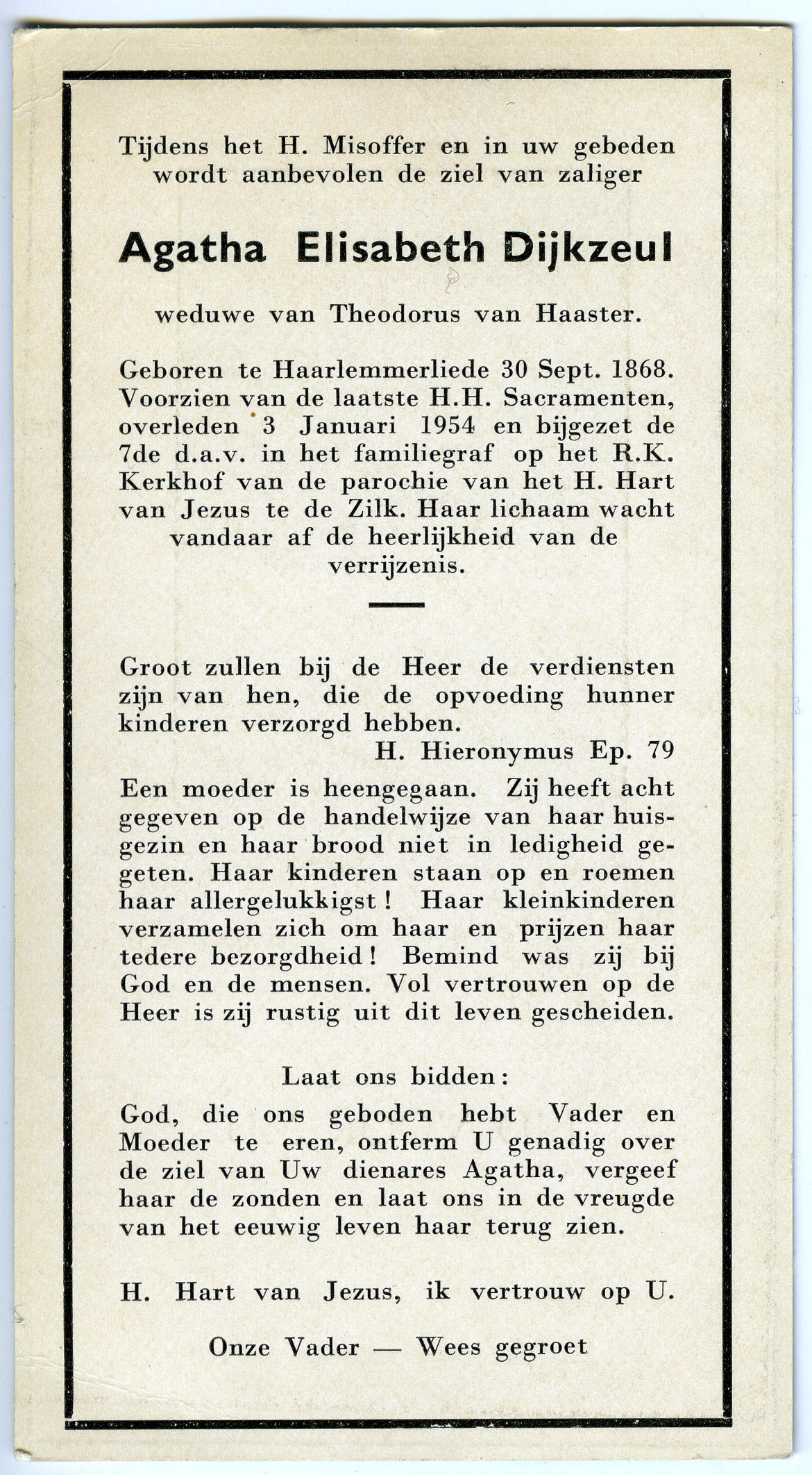 Bidprentje van Agatha Elisabeth Dijkzeul, 1954 (bidprentje)