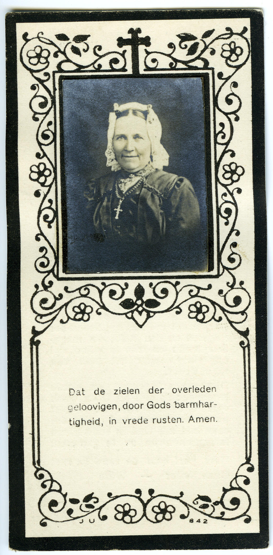 Bidprentje ter gedachtenis aan Martha Poland-Karsten, geboren omstreeks 1870 en overleden op 28 januari 1927 in Ouddijk. Martha is gekleed in West-Friese streekdracht.