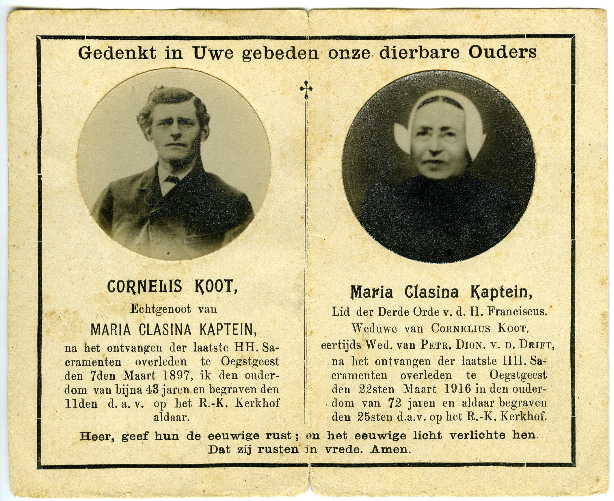 Bidprentje ter gedachtenis aan het echtpaar Cornelius Koot en Maria Clasina Koot-Kaptein. Cornelis is geboren op 10 maart 1853 in Koudekerk en overleden op 7 maart 1897 in Oegstgeest. Maria Clasina is geboren op 20 december 1843 in Hazerswoude en overleden op 22 maart 1916 in Oegstgeest. Cornelius is gekleed in modedracht. Maria Clasina draagt ...