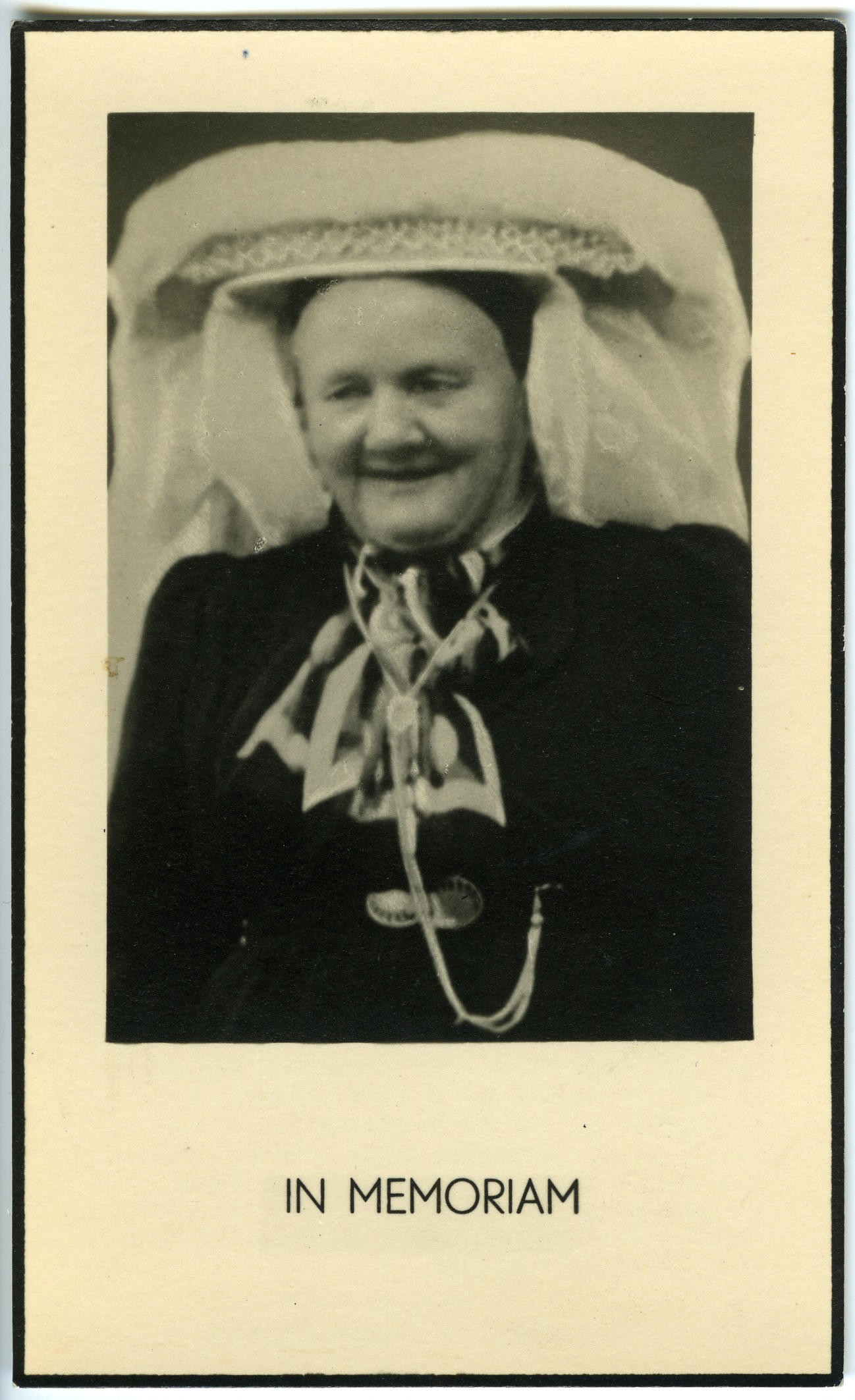 Bidprentje ter gedachtenis aan Hendrika Maria van Dooren, geboren in Veghel op 11 maart 1873 en overleden in Uden op 20 juli 1952. Hendrika is gekleed in Noord-Brabantse streekdracht.