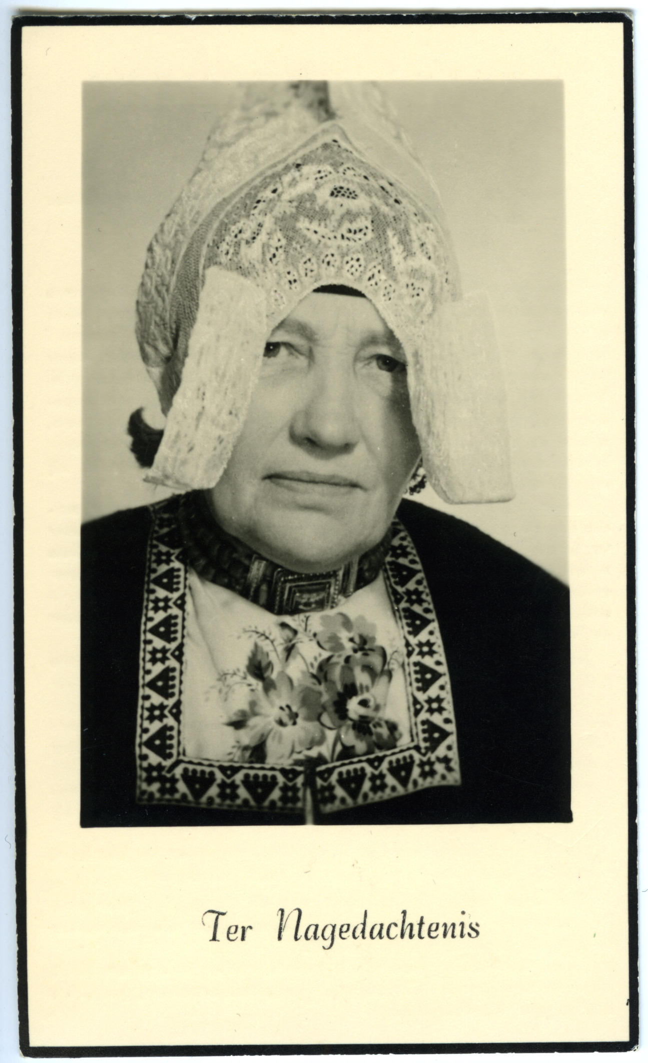 Bidprentje ter gedachtenis aan Grietje Jonk, geboren in Volendam op 28 oktober 1883 en overleden aldaar op 15 februari 1956. Grietje is gekleed in Volendammer dracht.