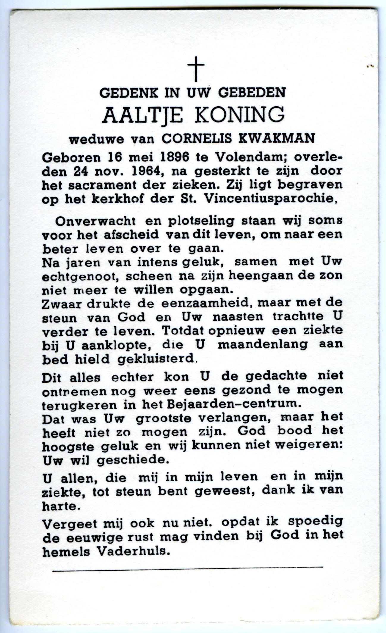 Bidprentje van Aaltje Koning, 1964 (bidprentje)