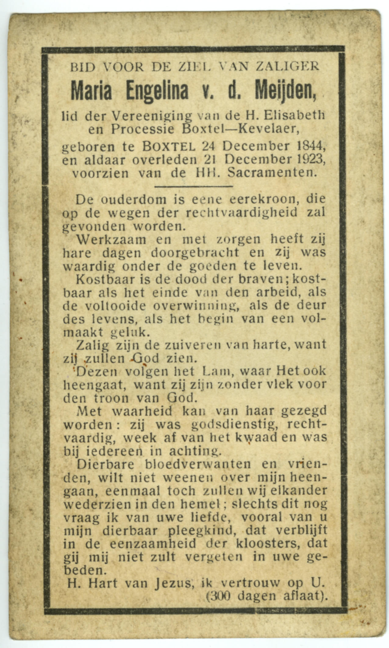 Bidprentje ter gedachtenis aan Maria Engelina van der Meijden, geboren in Boxtel op 24 december 1844 en overleden aldaar op 21 december 1923. Maria is gekleed in Oost-Brabantse streekdracht, zoals gedragen in de Meijerij van 's-Hertogenbosch. Om haar hals draagt ze een schuifketting met kwastjes aan het schuifje.