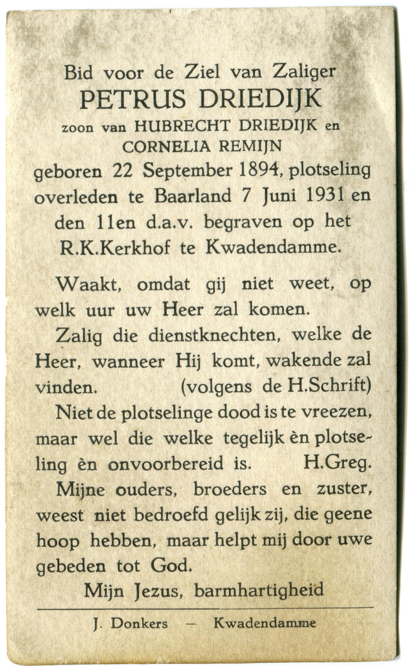 Bidprentje van Petrus Driedijk, 1931 (bidprentje)