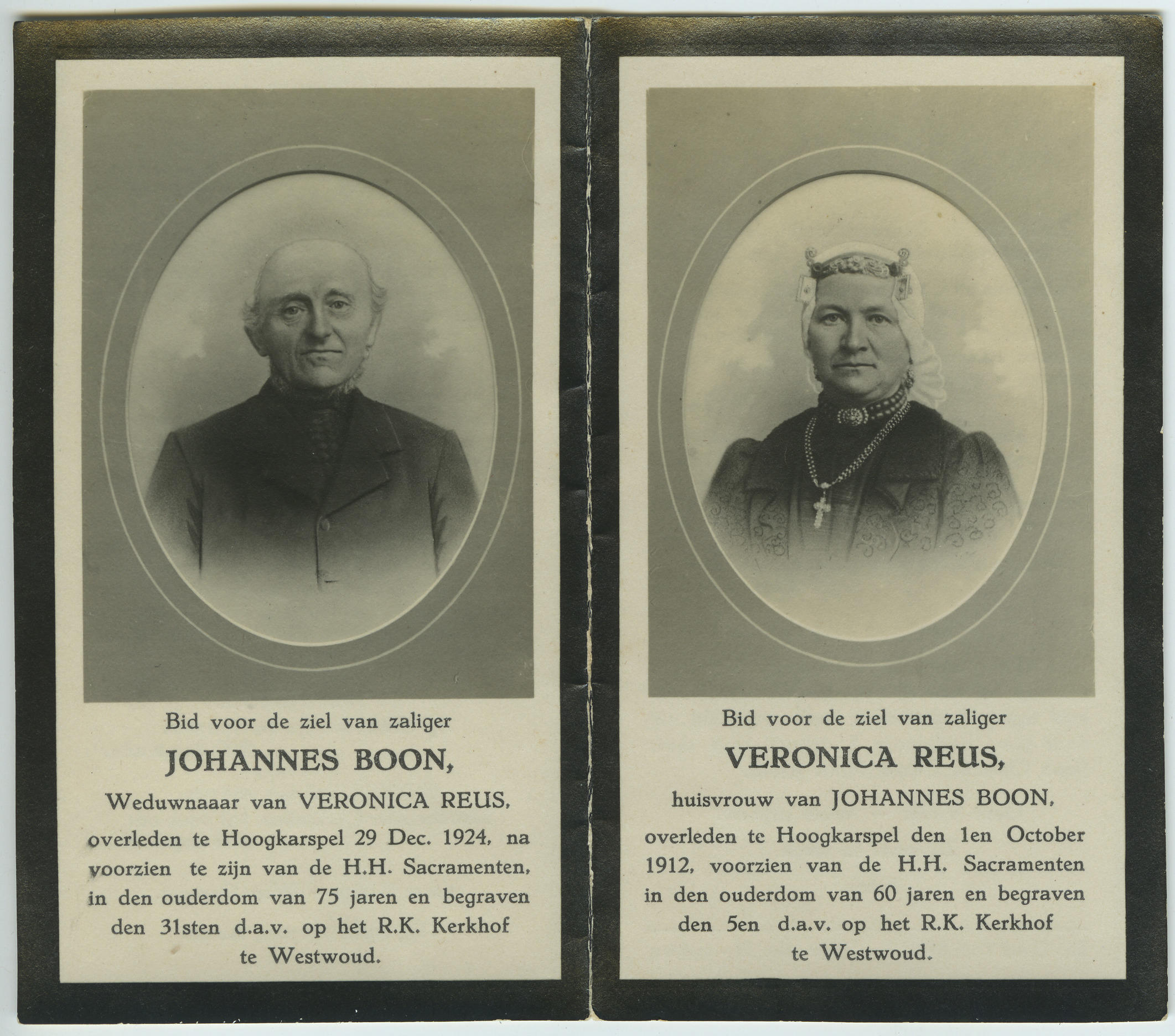 Bidprentje ter gedachtenis aan het echtpaar Johannes Boon en Veronica Boon-Reus. Johannes is geboren in 1849 en overleed in Hoogkarspel op 29 december 1924. Veronica is geboren op 3 september 1852 in Grootebroek en overleed op 1 oktober 1912 in Hoogkarspel. Johannes draagt algemene modedracht. Veronica is gekleed in West-Friese streekdracht.