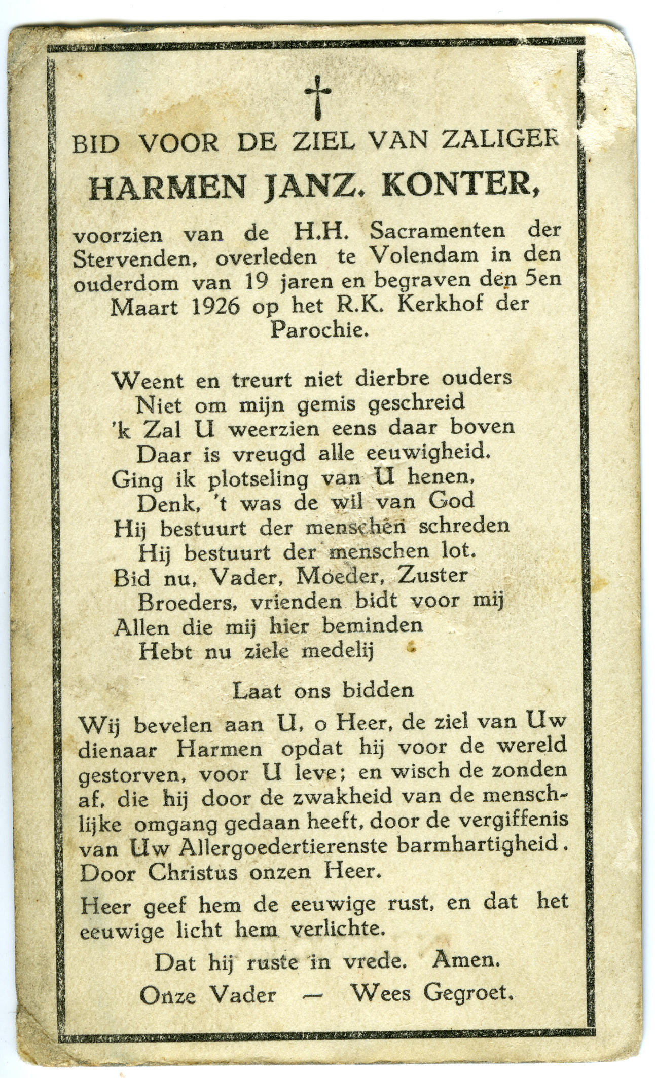 Bidprentje ter gedachtenis aan Harmen Janzoon Konter, geboren op 10 november 1906 in Volendam en overleden in Volendam op 3 maart 1926. De familie Konter was afkomstig van het voormalige eiland Schokland. Op de foto is niet goed te zien of Harmen gekleed is in streekdracht of burgerdracht. Het lijkt er op dat hij een ...