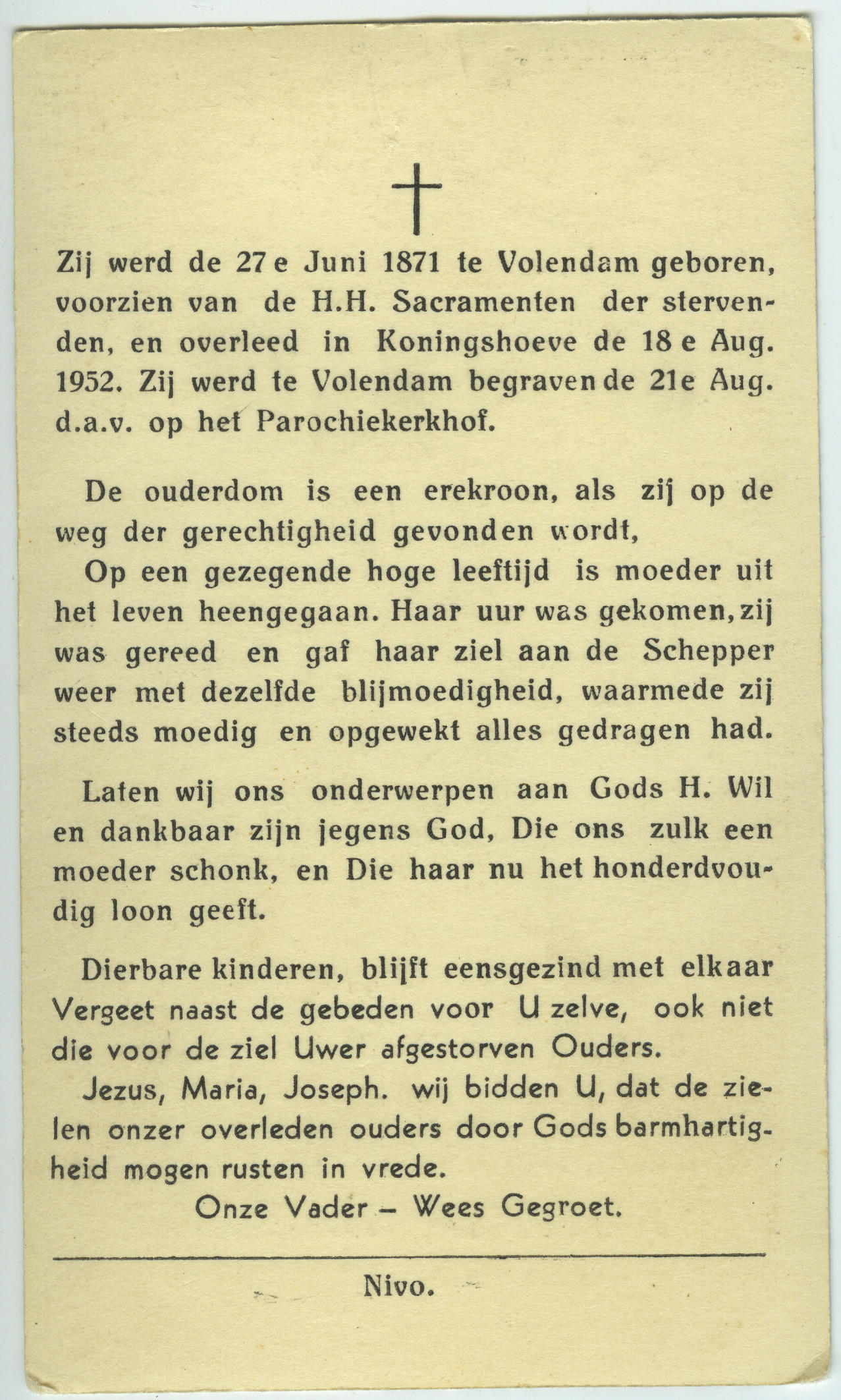 Bidprentje ter gedachtenis aan Agatha (Aagje) Klouwer-Schilder. Ze had de bijnaam 'Aagje van 't Jagertje'. Agatha is geboren op 27 juni 1871 in Volendam en overleden in Koningshoeve op 18 augustus 1952. Agatha was gehuwd met visser Albert (Kobus) Klouwer. Op de foto is ze gekleed in Volendammer streekdracht.