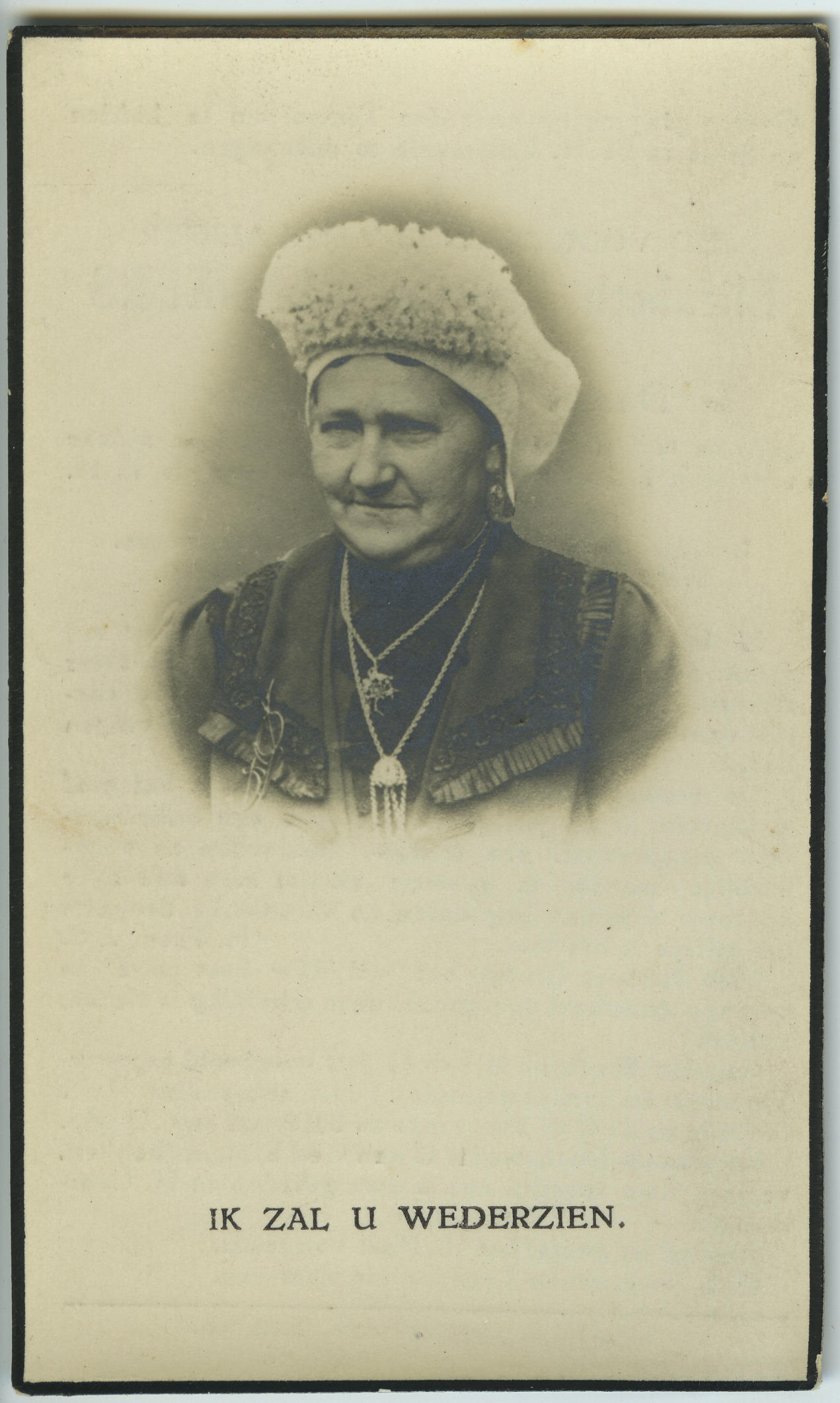 Bidprentje ter gedachtenis aan Elizabeth Laurina Peeters-Blankers, geboren op 10 augustus 1858 in Oud Gastel en aldaar overleden op 1 september 1931. Elizabeth is op de foto gekleed in West-Brabantse streekdracht. Ze was gehuwd met Daniël Cornelis Peeters.