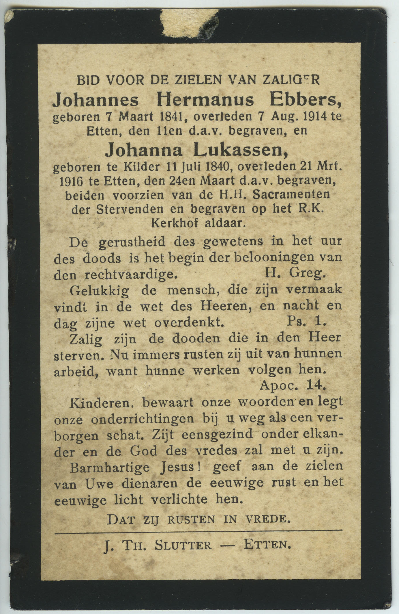Bidprentje ter gedachtenis aan Johanna Ebbers-Lukassen en Johannes Hermanus Ebbers. Johannes Hermanus is geboren op 7 maart 1841 in Gendringen en overleden op 7 augustus 1914 in Etten. Johanna is geboren op 11 juli 1840 in Kilder en overleden op 21 maart 1916 in Etten. Het echtpaar is op de foto gekleed in Gelderse streekdracht. ...