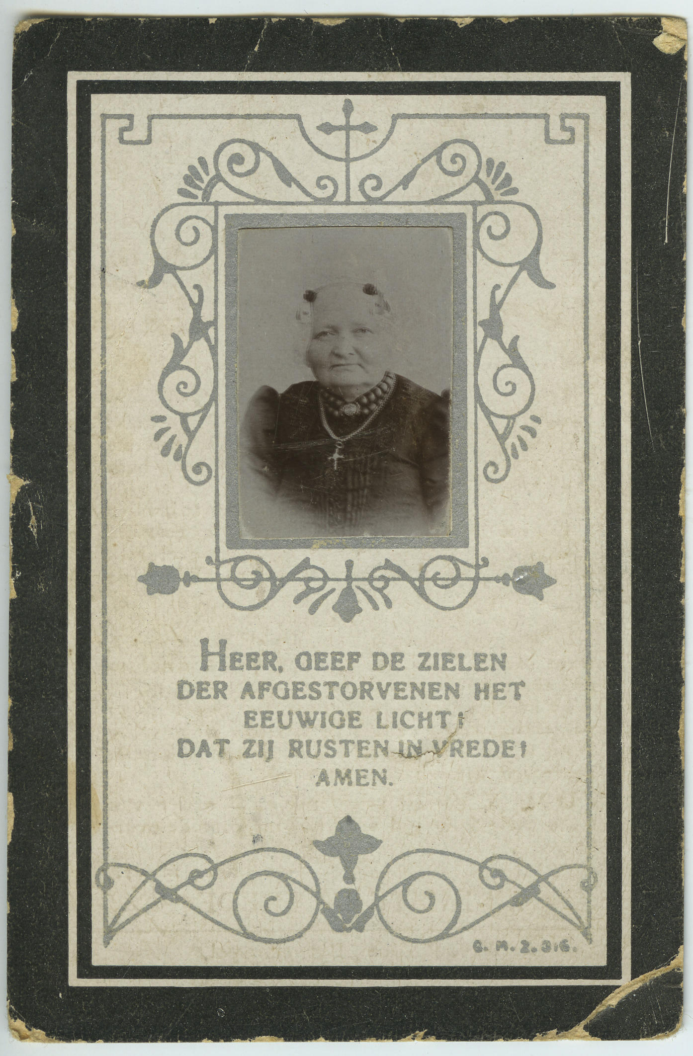 Bidprentje ter gedachtenis aan Maria Slot-Koopman. Het bidprentje heeft een opgeplakte foto. Maria overleed op 4 maart 1911 in Bovenkarspel en werd op 8 maart 1911 aldaar begraven. Zij is gekleed in Noord-Hollandse streekdracht. Maria was gehuwd met Cornelis Slot.