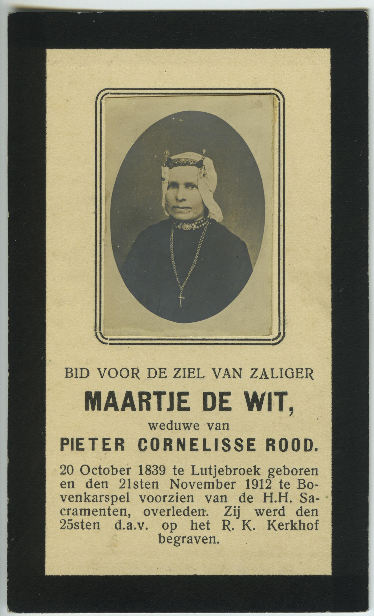 Bidprentje ter gedachtenis aan Maartje Rood-de Wit. Het bidprentje heeft een opgeplakte foto. Elisabeth werd geboren op 20 oktober 1839 in Lutjebroek. Ze overleed op 21 november 1912 in Bovenkarspel. Zij is gekleed in Noord-Hollandse streekdracht. Maria was gehuwd met Pieter Cornelisse Rood.