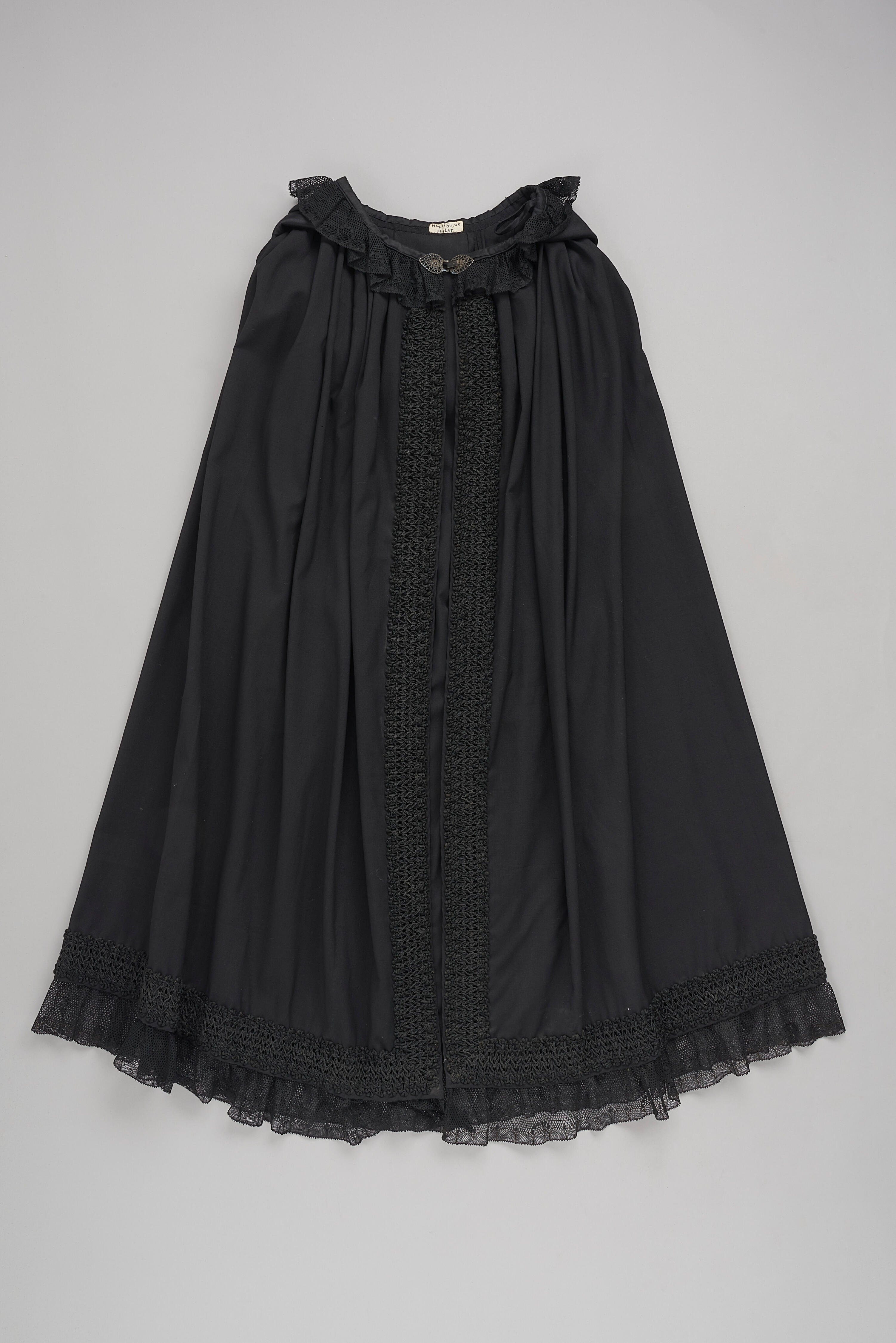 Zwarte wollen cape met capuchon, een zogenoemde kapmantel. Dit soort mantels werd gedragen door vrouwen in streekdracht uit Hulst en omgeving. Dit exemplaar is in 1950 vervaardigd. De kapmantel wordt aan de voorzijde gesloten met een zilveren haak en oog.