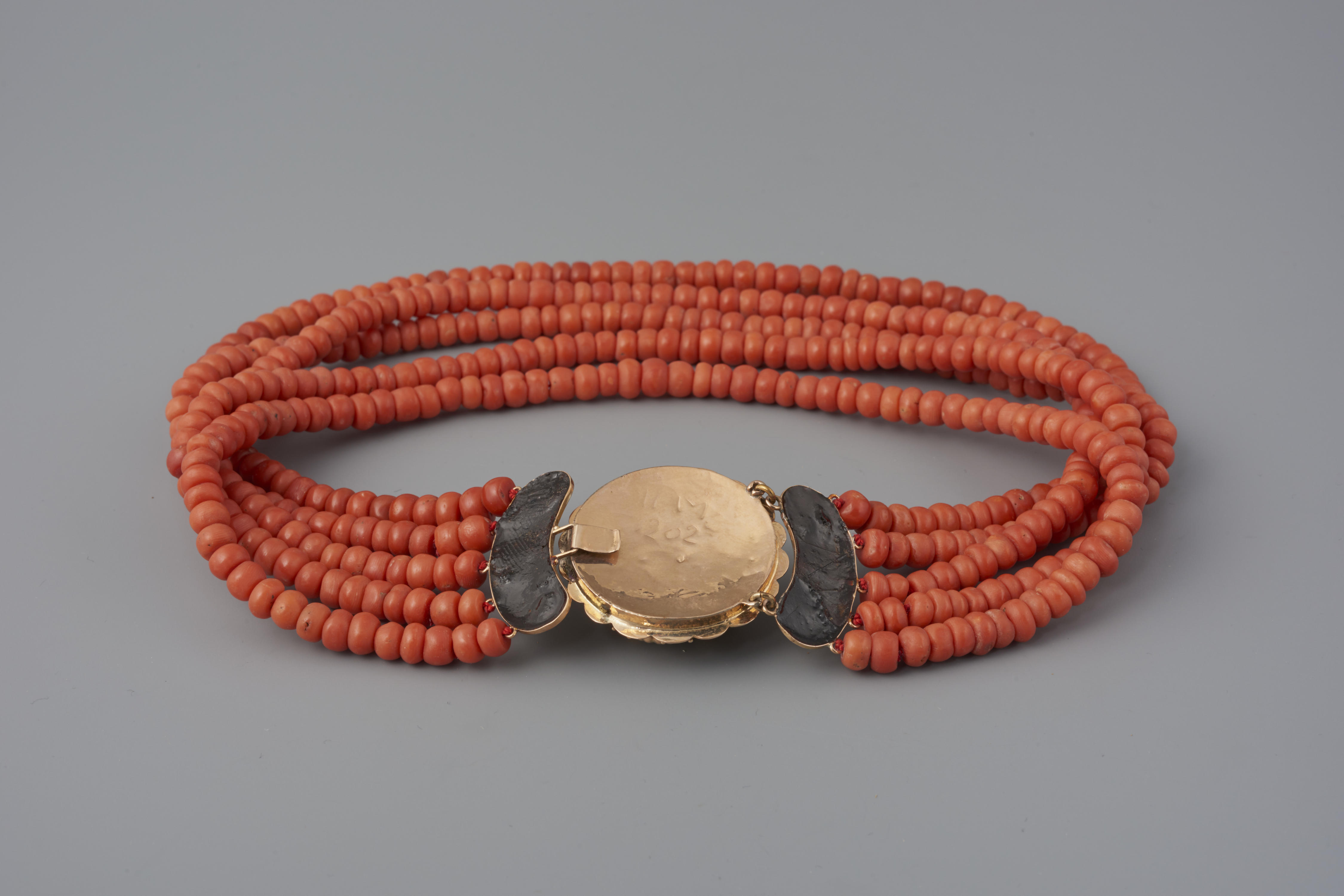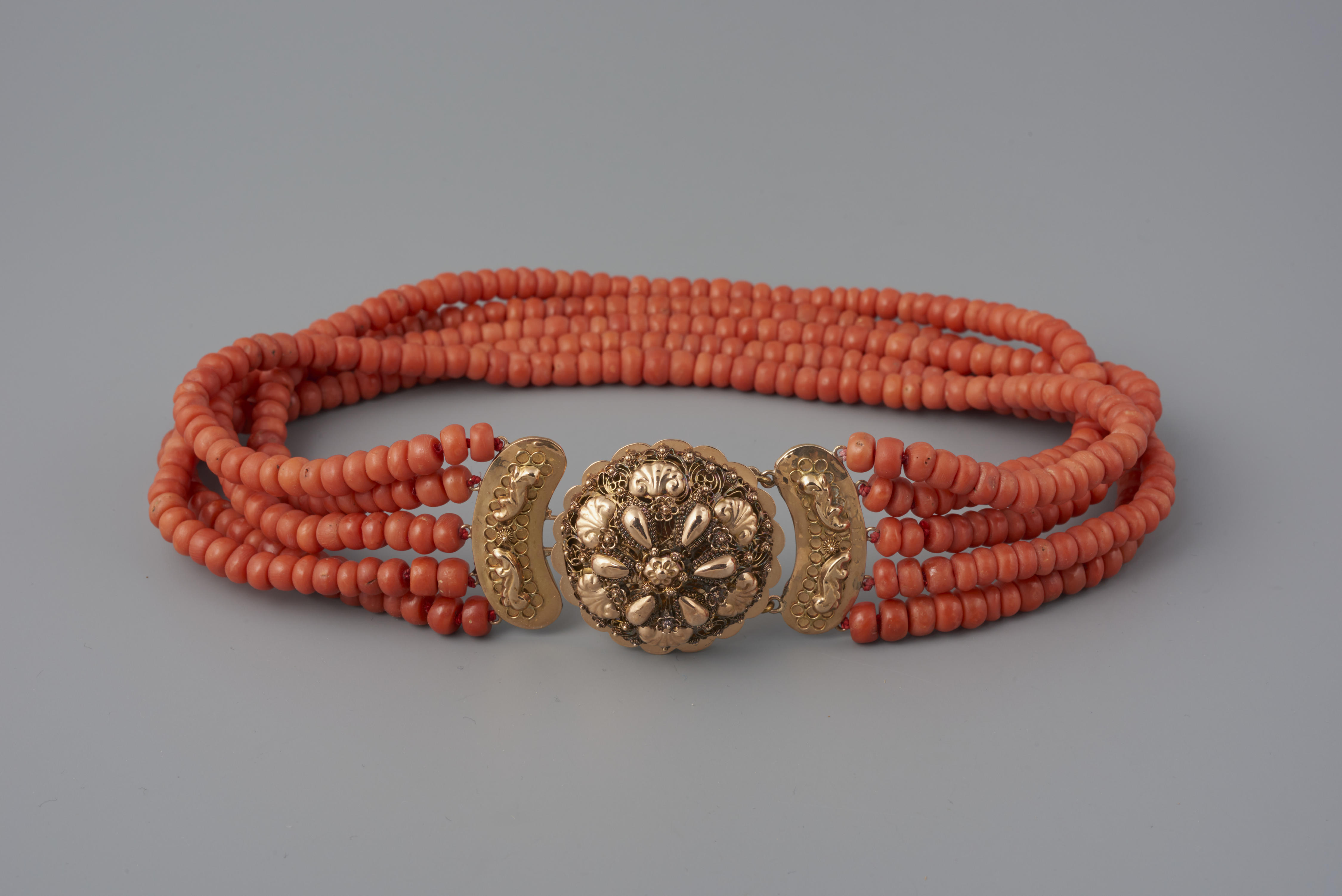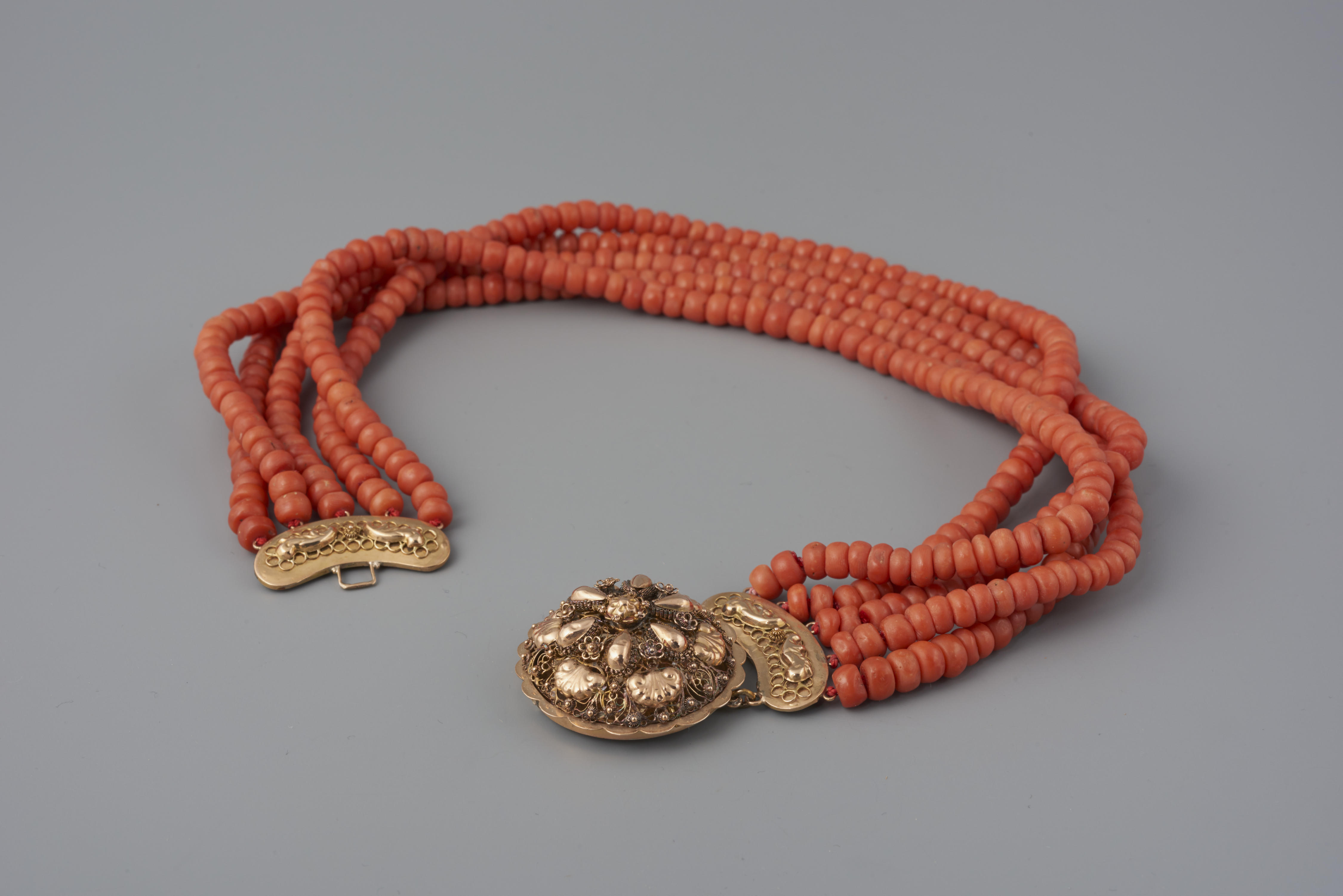 Halssnoer, bestaande uit vijf strengen bloedkoraal aan een 14-karaats gouden slot, gemaakt omstreeks 1910. Het snoer is gedragen door een vrouw van het eiland Walcheren. De vervaardiger is onbekend.