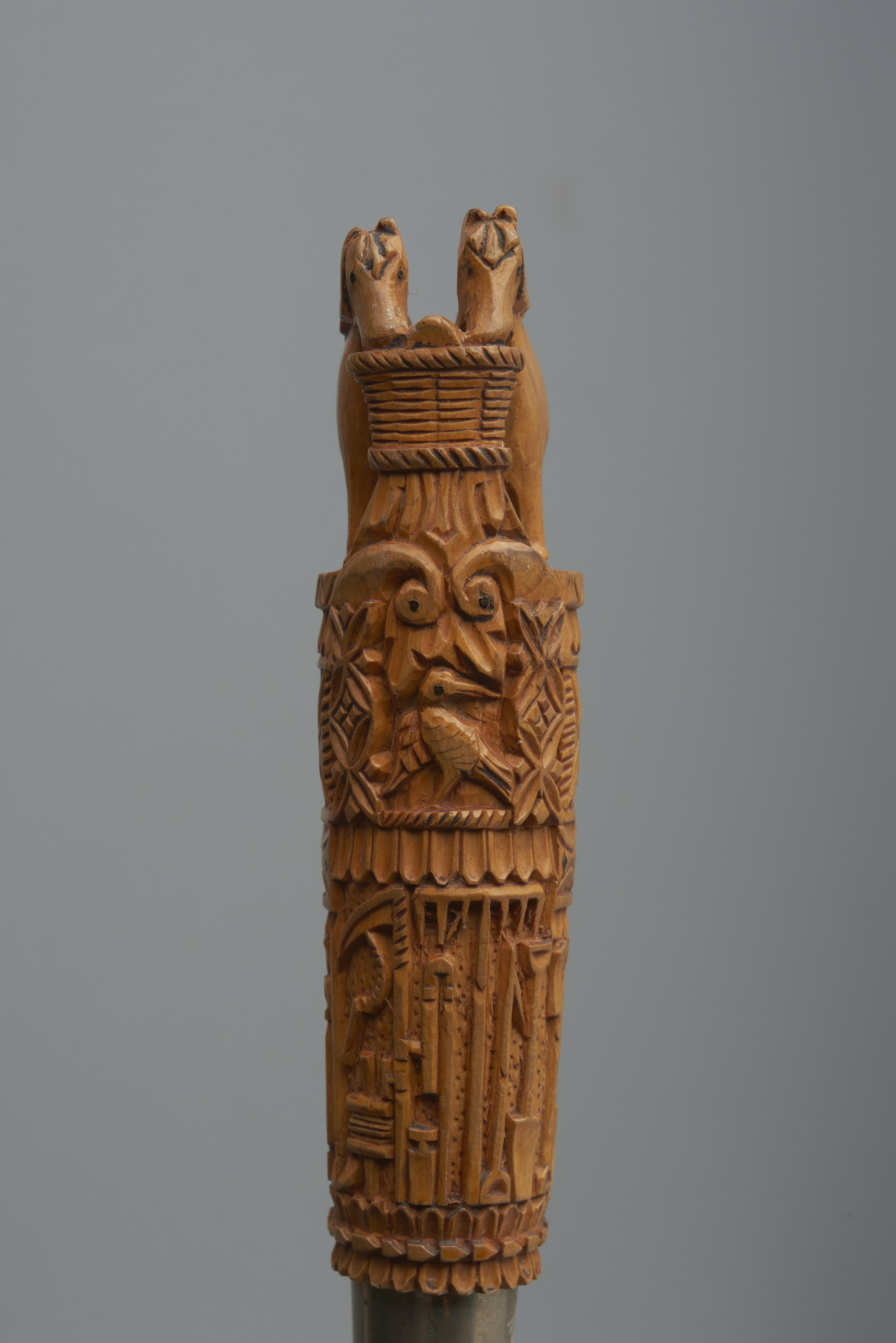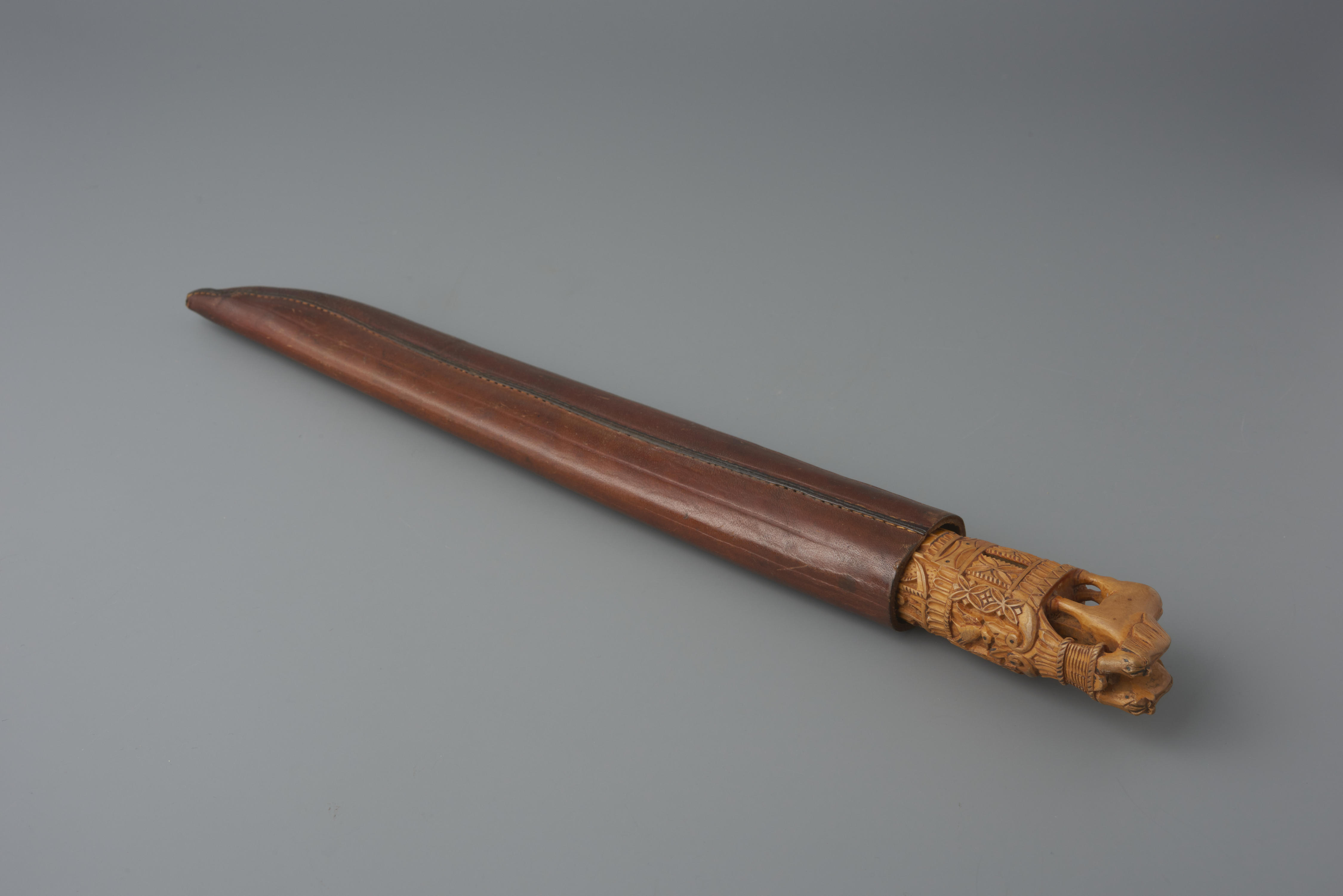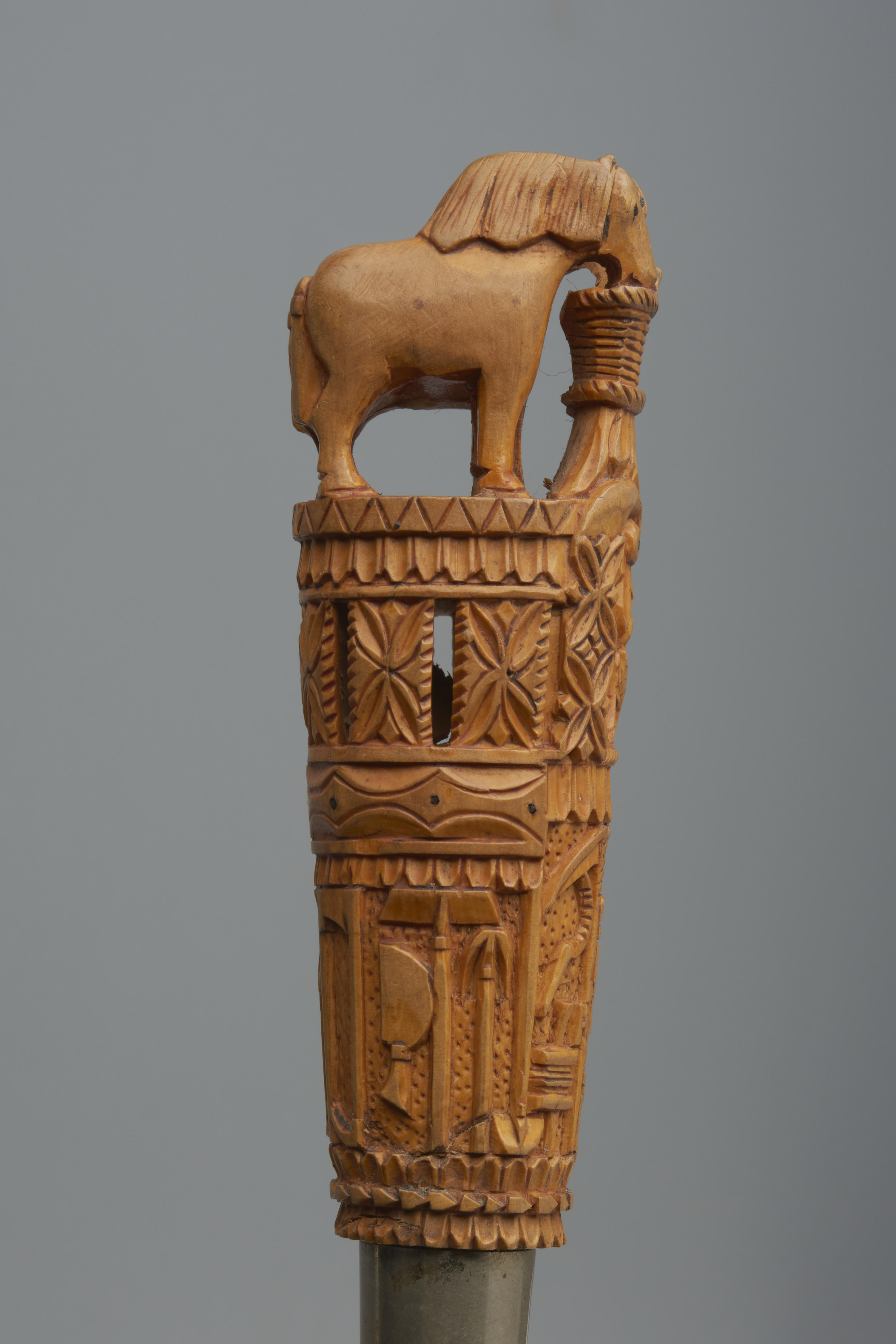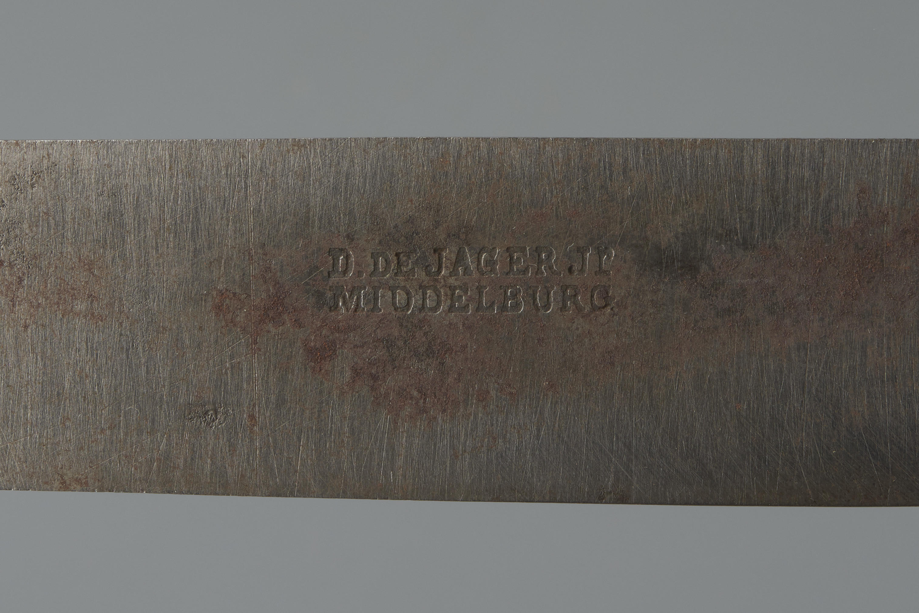 Mes met een bewerkt houten heft. Aan de bovenzijde zijn twee paarden die uit een mand eten en allerlei gereedschappen uitgesneden. Op grond van het snijwerk is dit mes toegeschreven aan Cornelis Pouwer uit Oost Souburg. Het lemmet is gemaakt in het Duitse Solingen, waarschijnlijk door Herder. Het lemmet is gemerkt met 'D. de Jager ...
