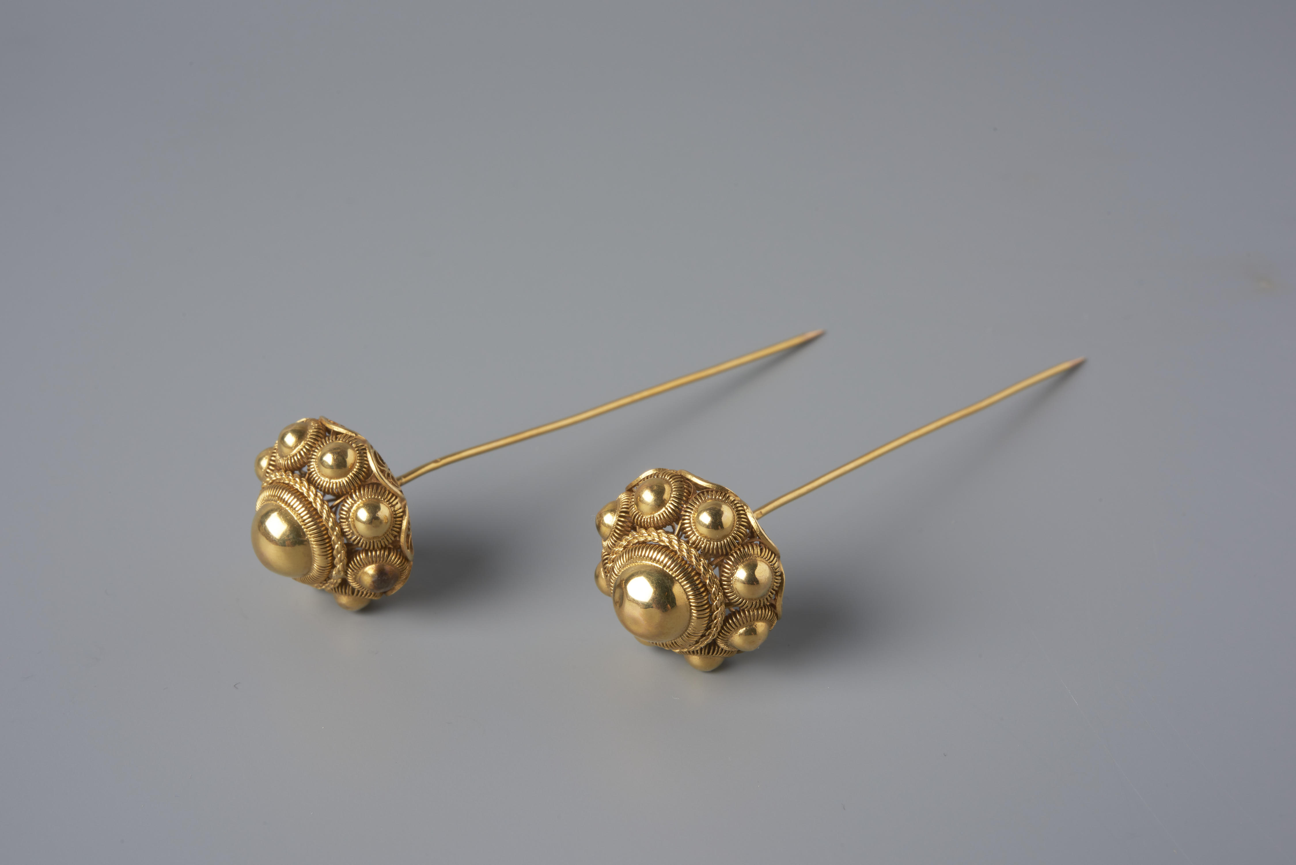 Paar gouden 'knopspelden', gedragen in Nieuw- en Sint Joosland. De spelden werden verticaal in de ondermuts gestoken. Ze zijn mogelijk rond 1925 vervaardigd door J.H. van der Ven in Dordrecht. Dit type mutsspeld werd op heel Walcheren gedragen.