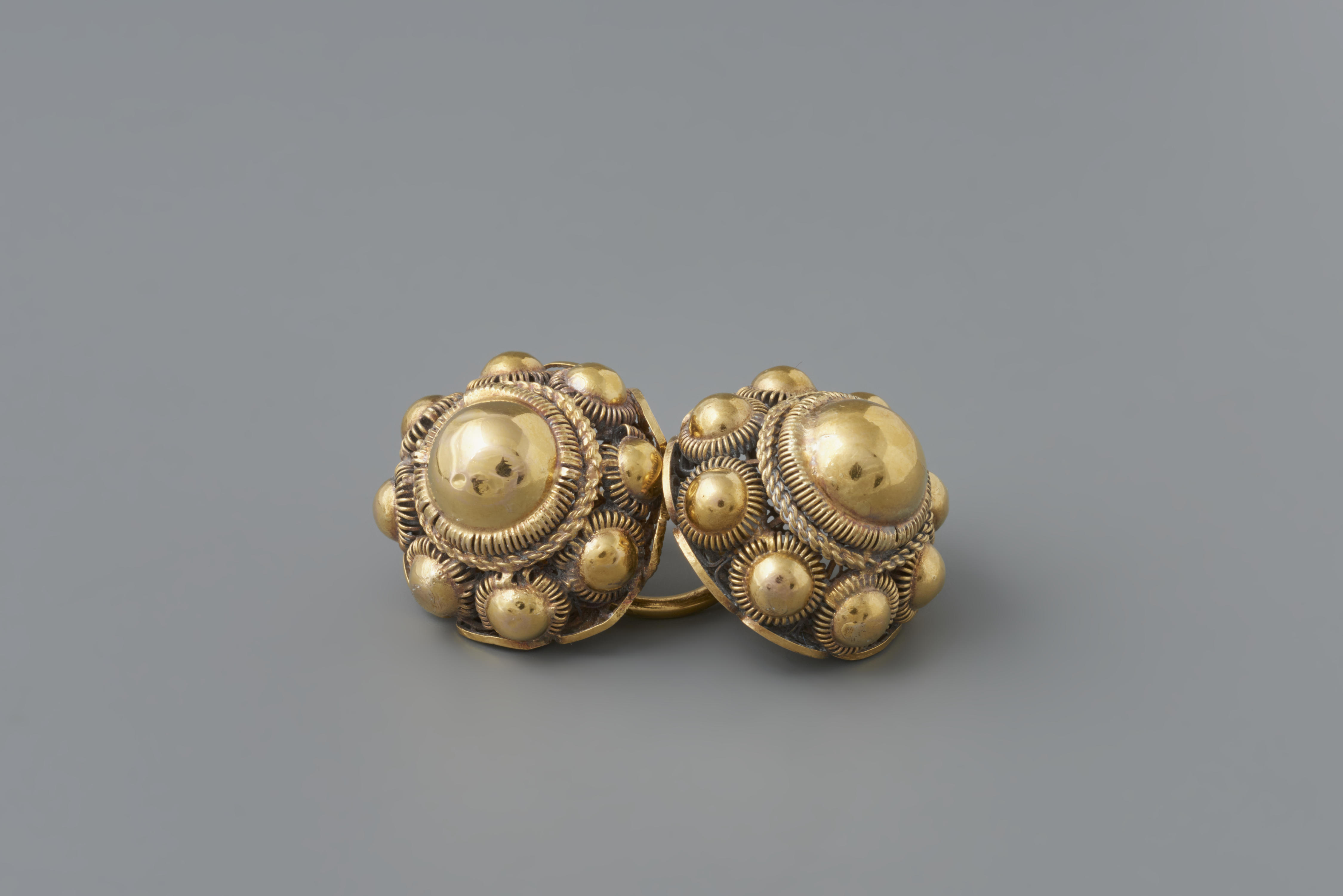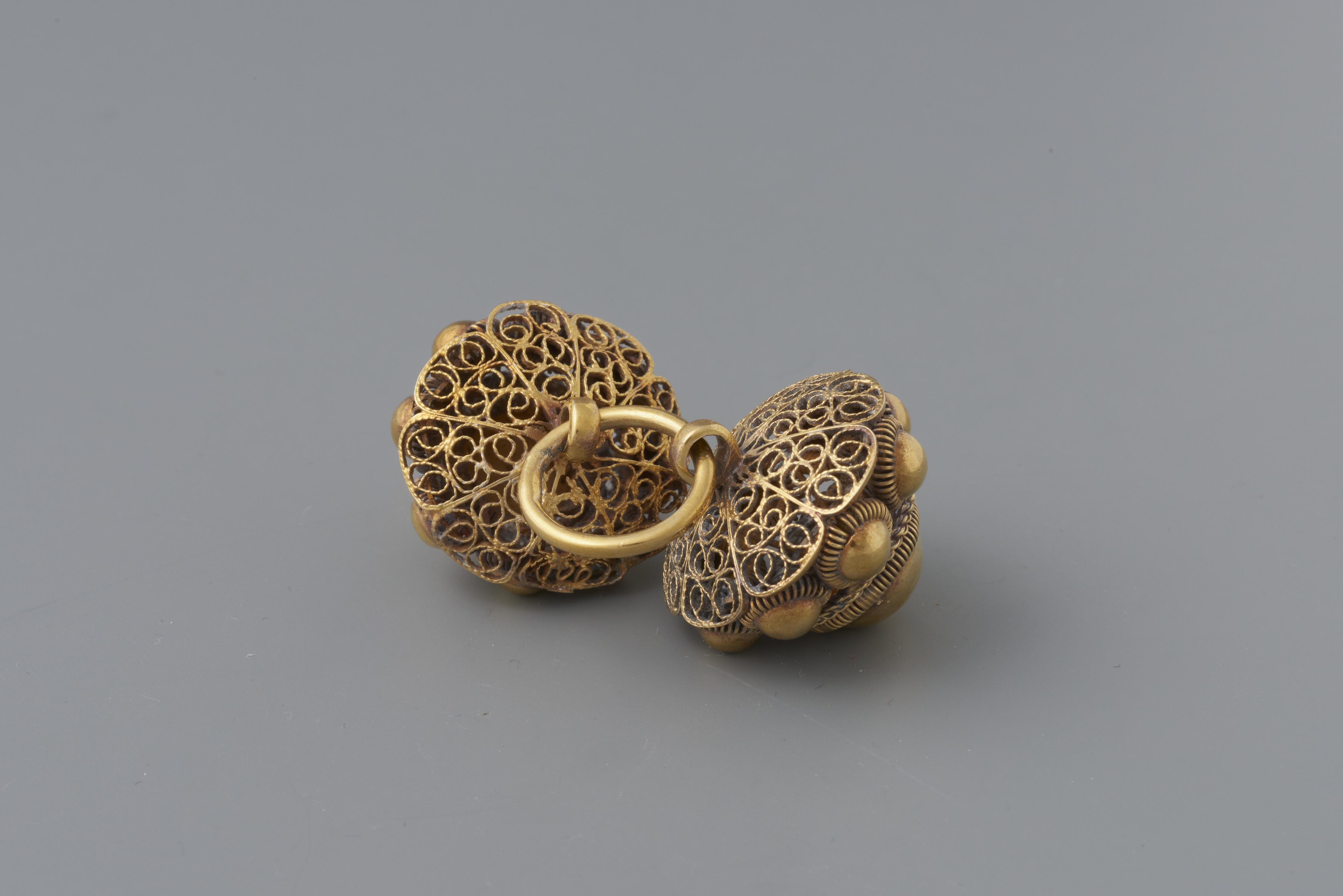 Paar keelknopen van ongewaarborgd goud uit omstreeks 1900. Dergelijke keelknopen werden gedragen door mannen en jongens uit Axel. Keelknopen werden gebruikt om de halsboord van het hemd of van het overhemd te sluiten. Dit model werd behalve in Axel ook gedragen op Zuid-Beveland en op Walcheren, maar ook op de Veluwe en op Urk. Alleen ...