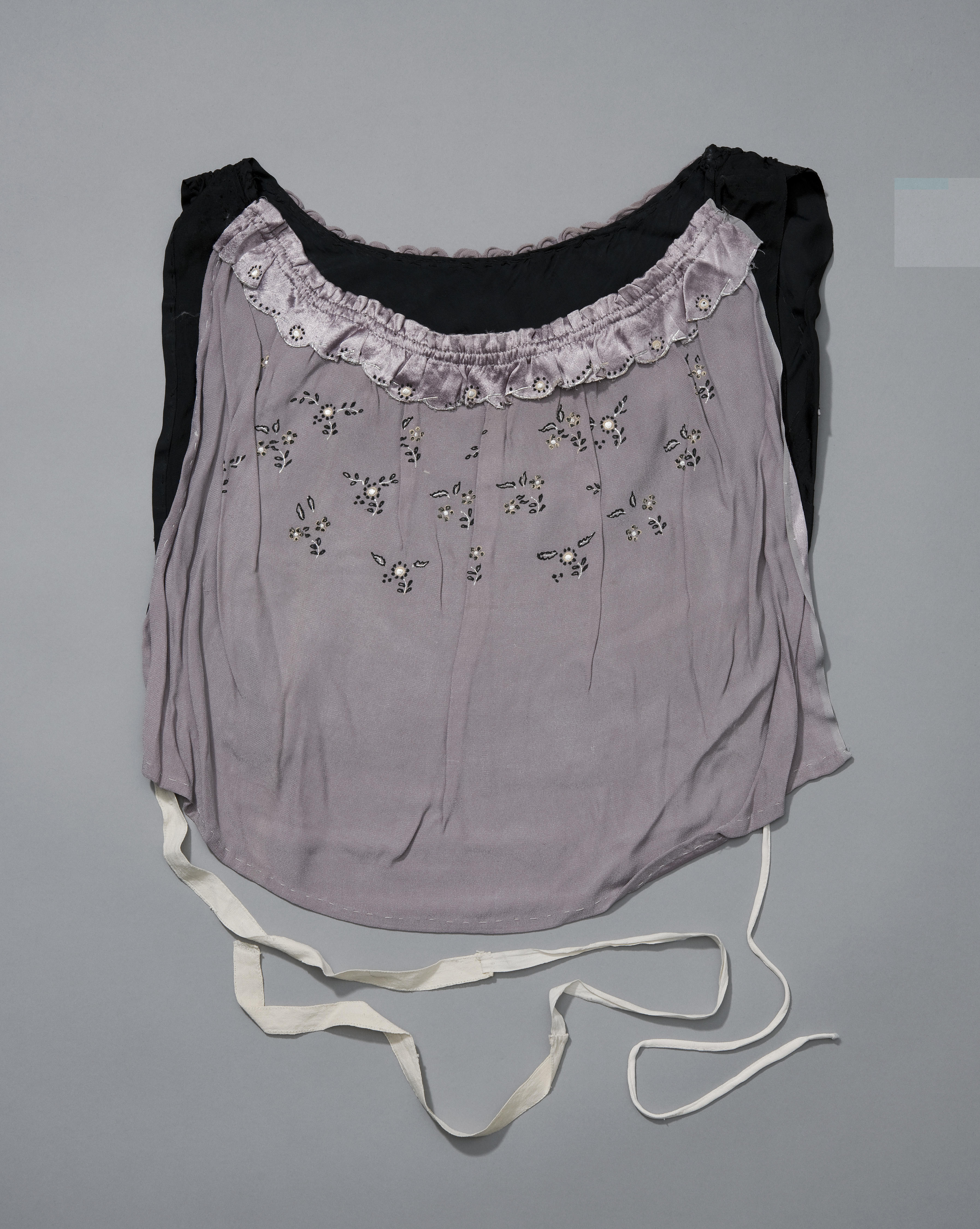 Beuk van grijze kunstzijde met opgespoten bloem- en bladmotieven. Model, materiaal en wijze van de versiering wijzen op een datering van omstreeks 1950.