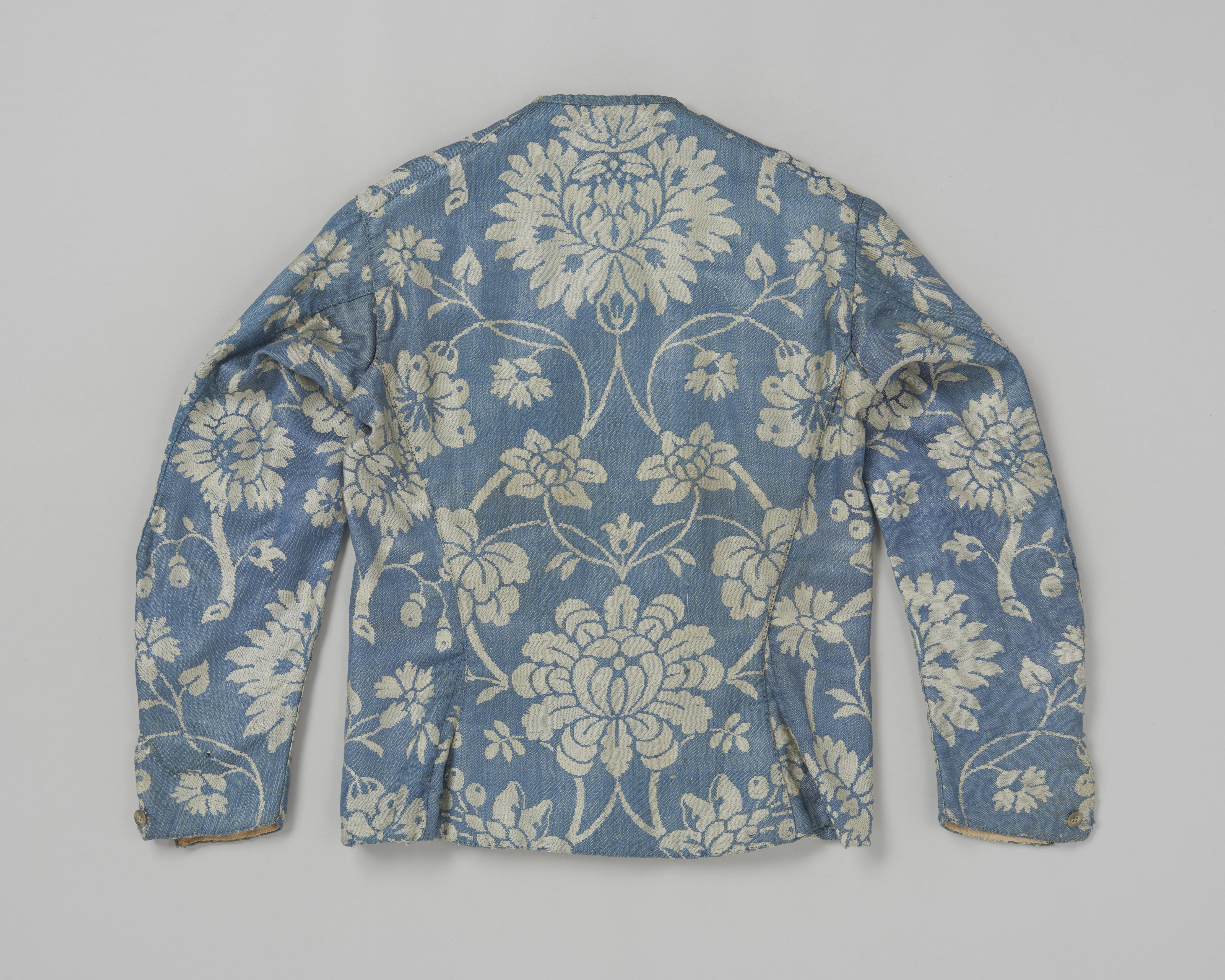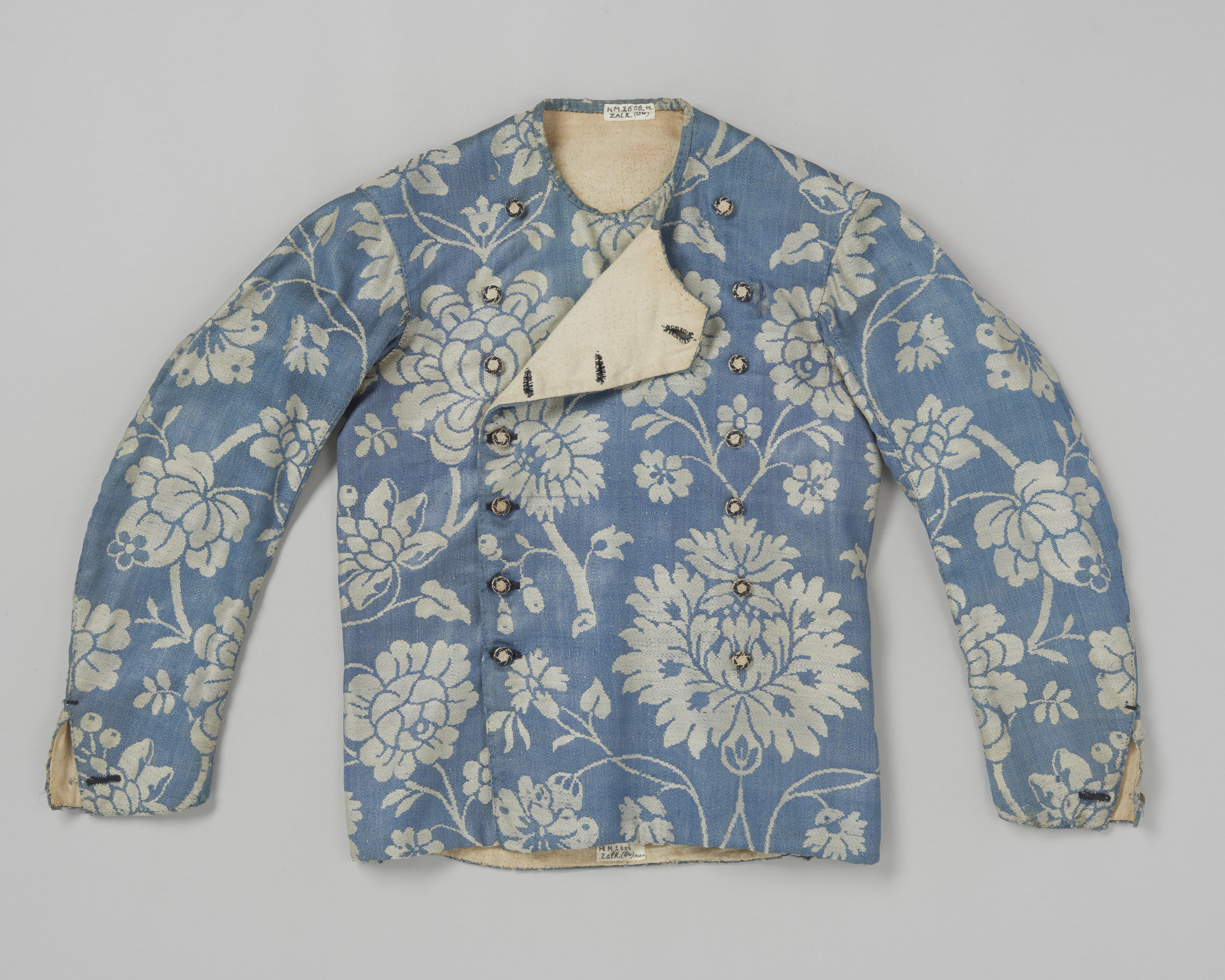Hemdrok van wollen damast met een grootbloemig floraal dessin in blauw en zilvergrijs. De hemdrok heeft een dubbele knoopsluiting met knopen van papier die omwikkeld zijn met blauw en wit garen.