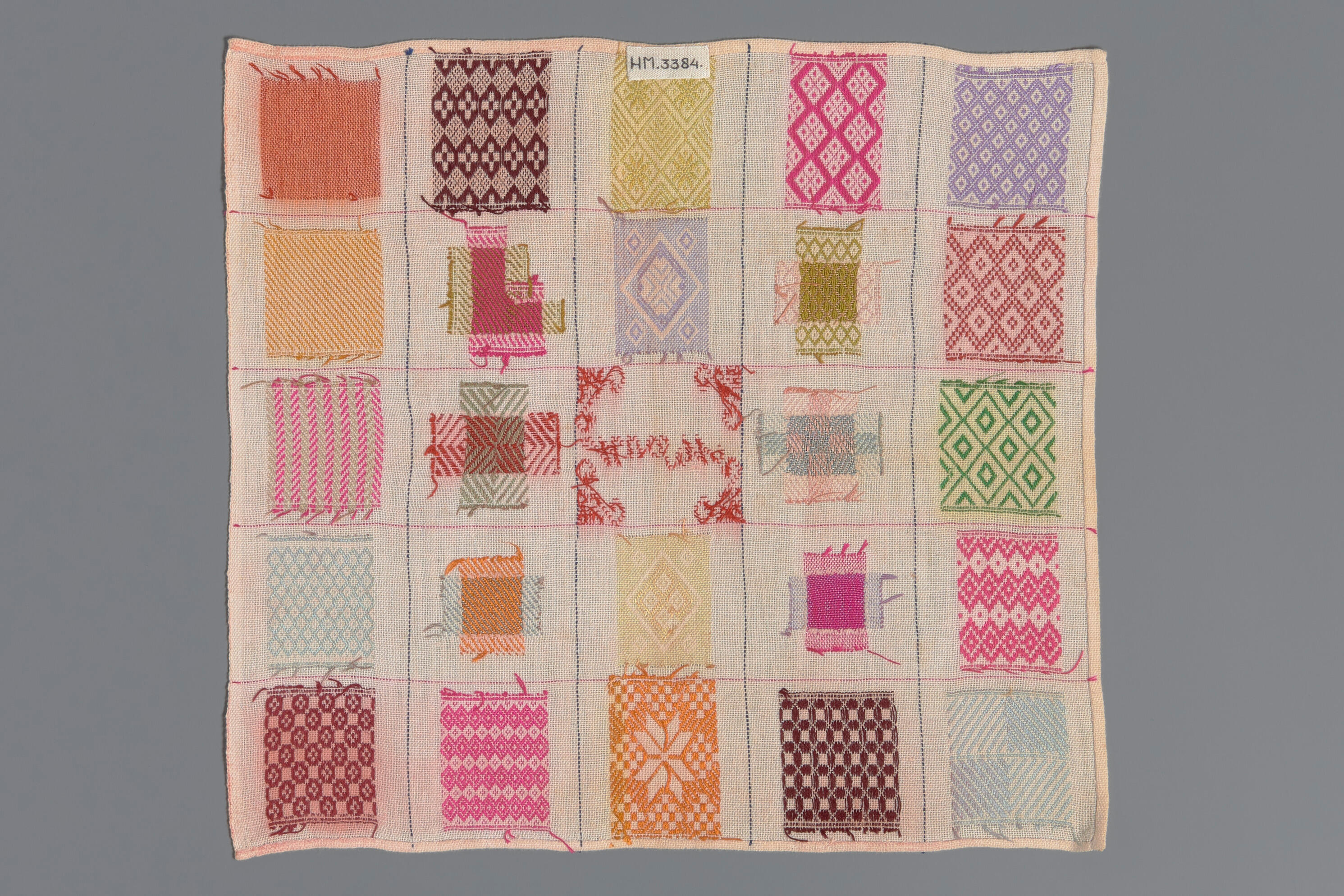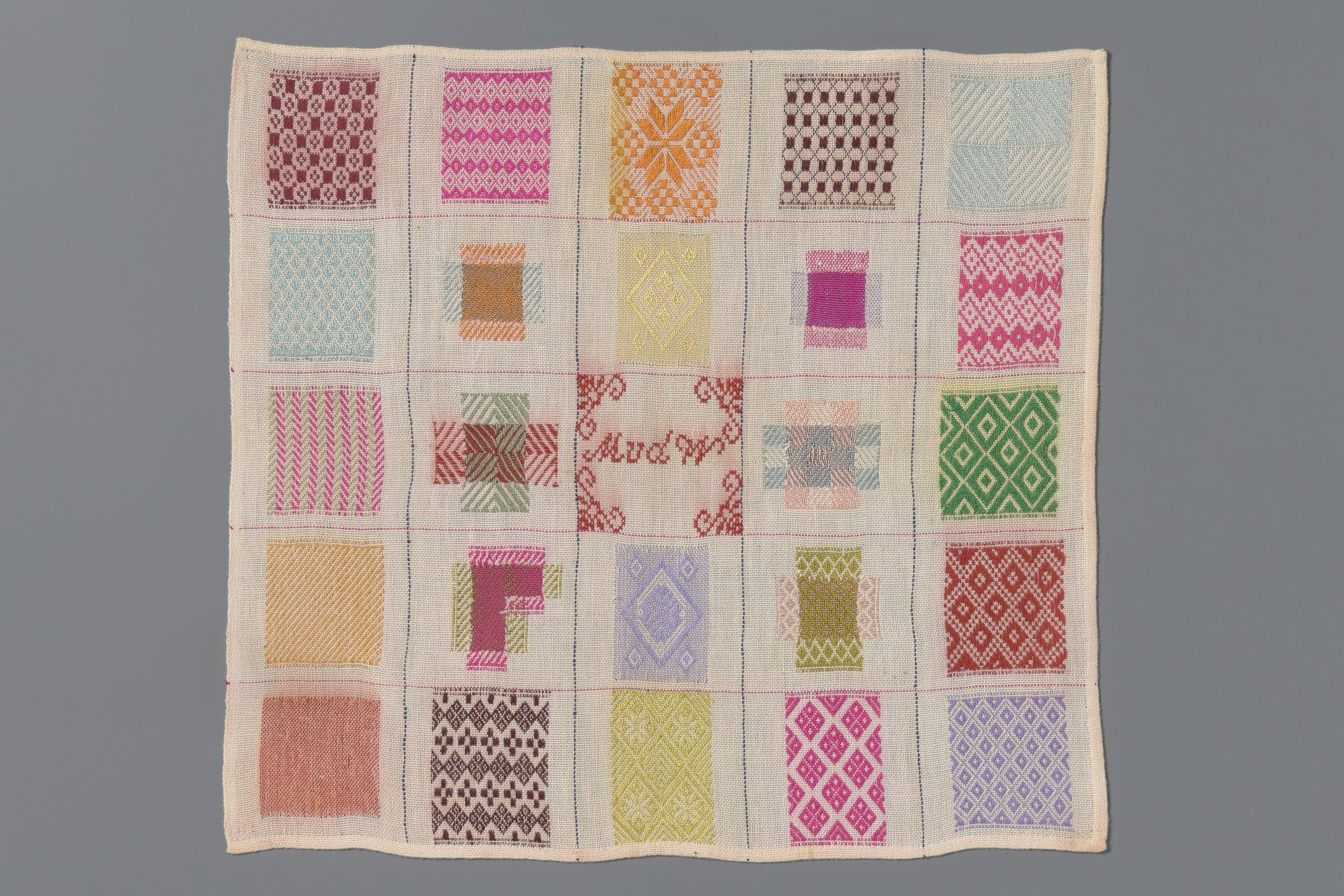 Stoplap van dun katoenen stopgaas en met felle kleuren zijden garen gestopt. De lap is met een rijgsteek verdeeld in 25 vierkanten, waarvan 24 met verschillende stoppen in diverse technieken. In het middelste vierkant staan de initialen MvdW en hoekversieringen in kruissteektechniek. De lap heeft één zelfkant. Drie kanten zijn met de hand gezoomd.