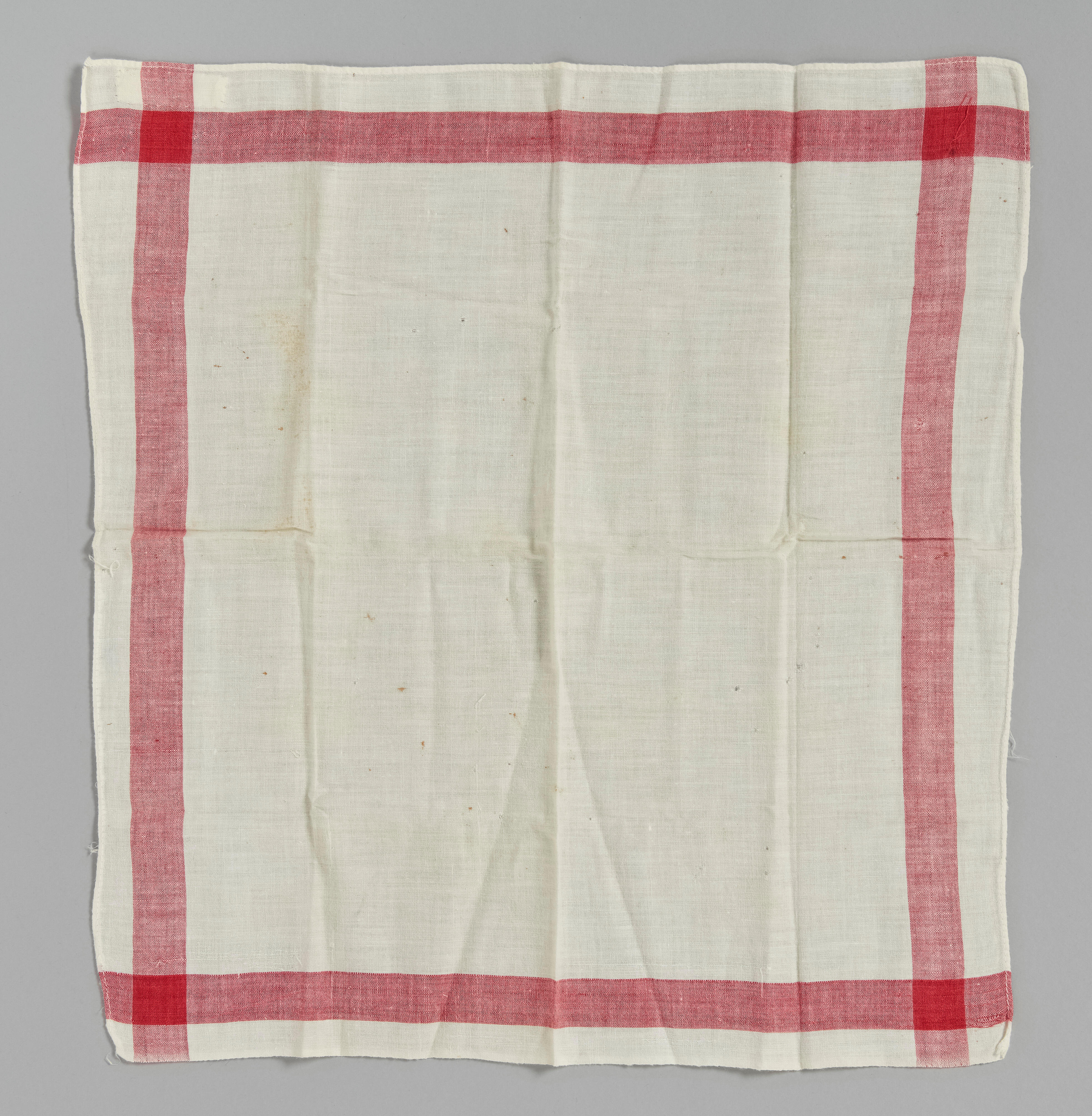 Witte katoenen zakdoek met ingeweven rode rand. De zakdoek is gebruikt door een protestantse vrouw in Zuid-Bevelandse streekdracht.