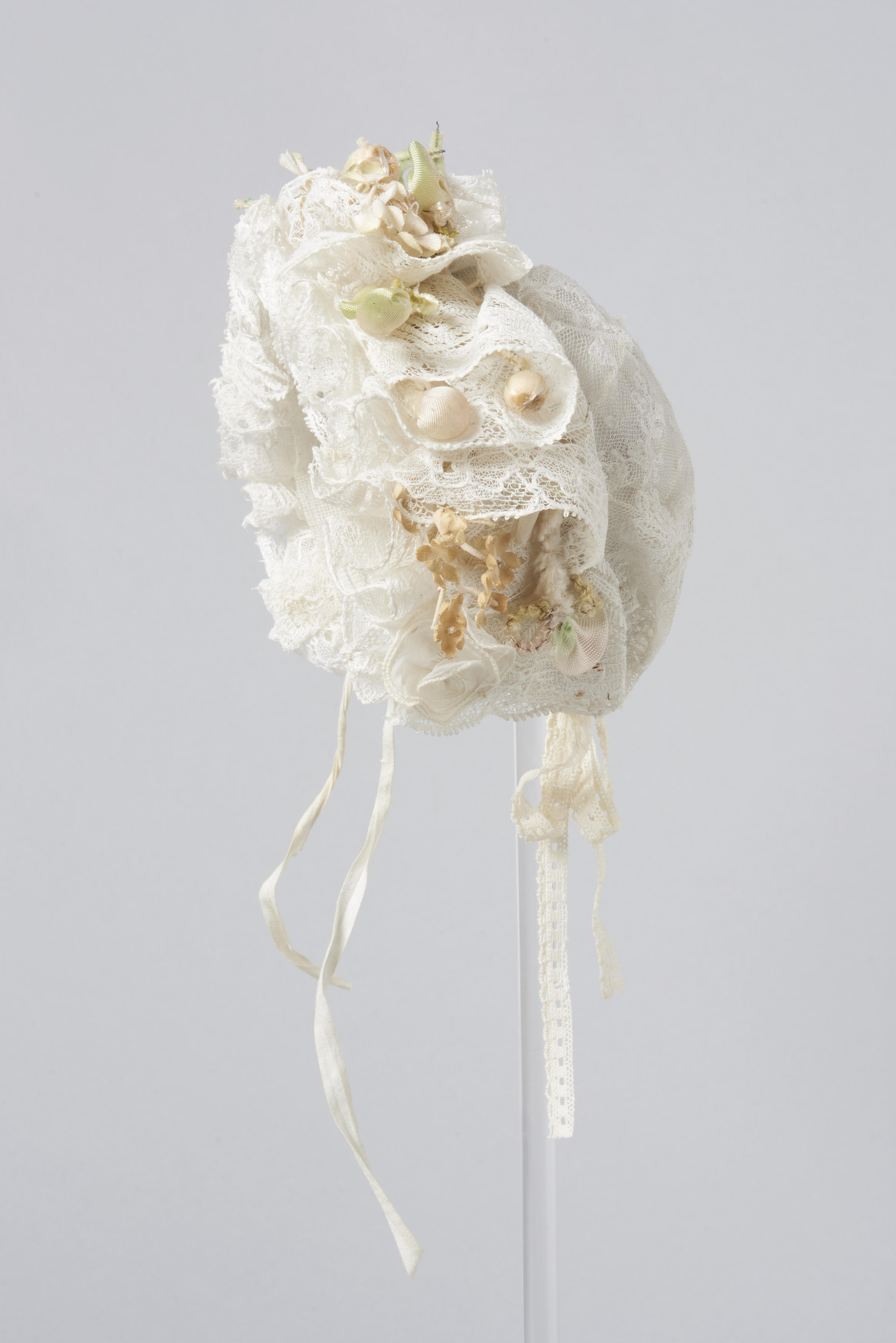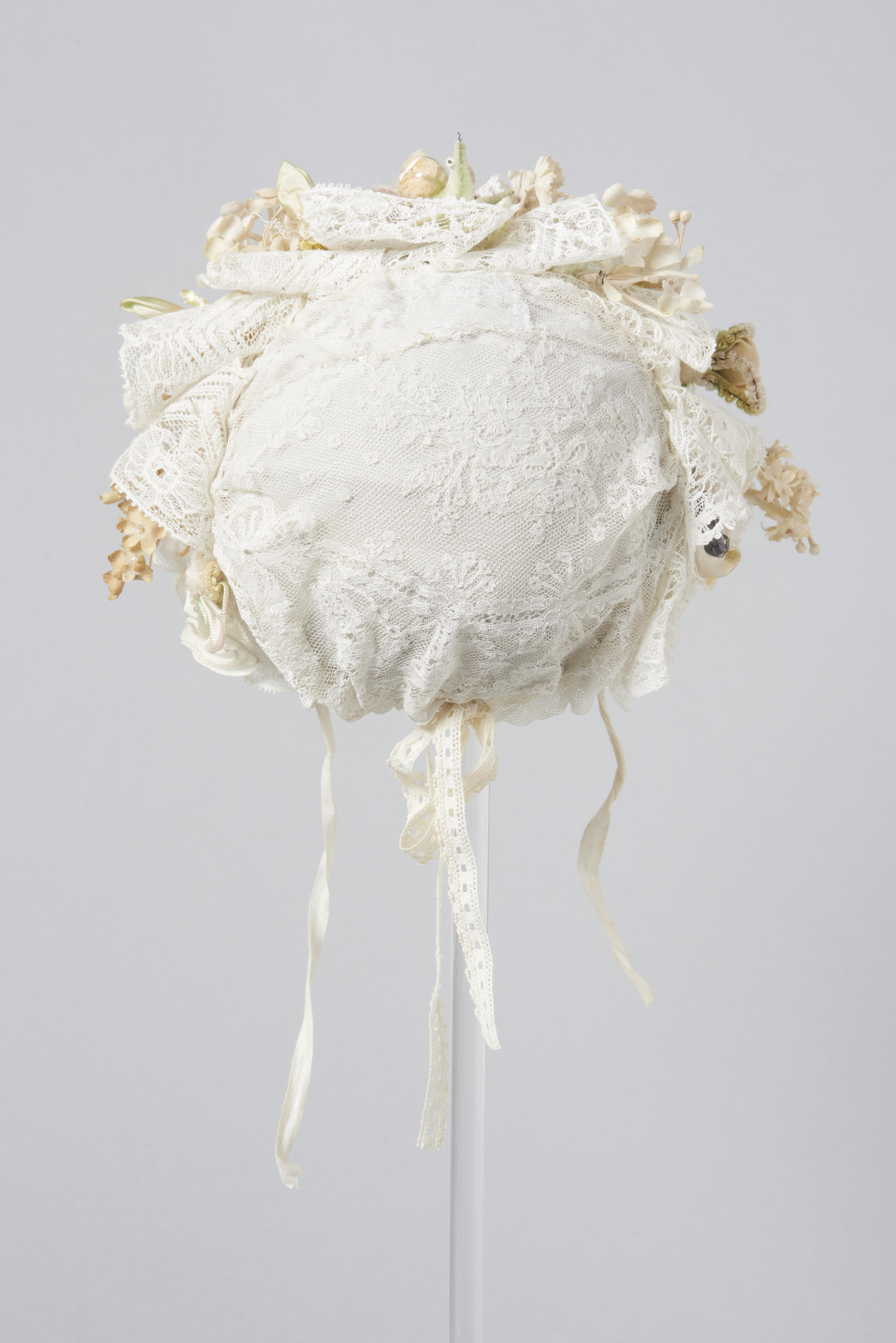 Doopmutsje met versieringen van lint, kant en kleine kunstbloemen. Dergelijke opmaak komt vooral veel in Brabant voor, ook op de vrouwenmutsen.