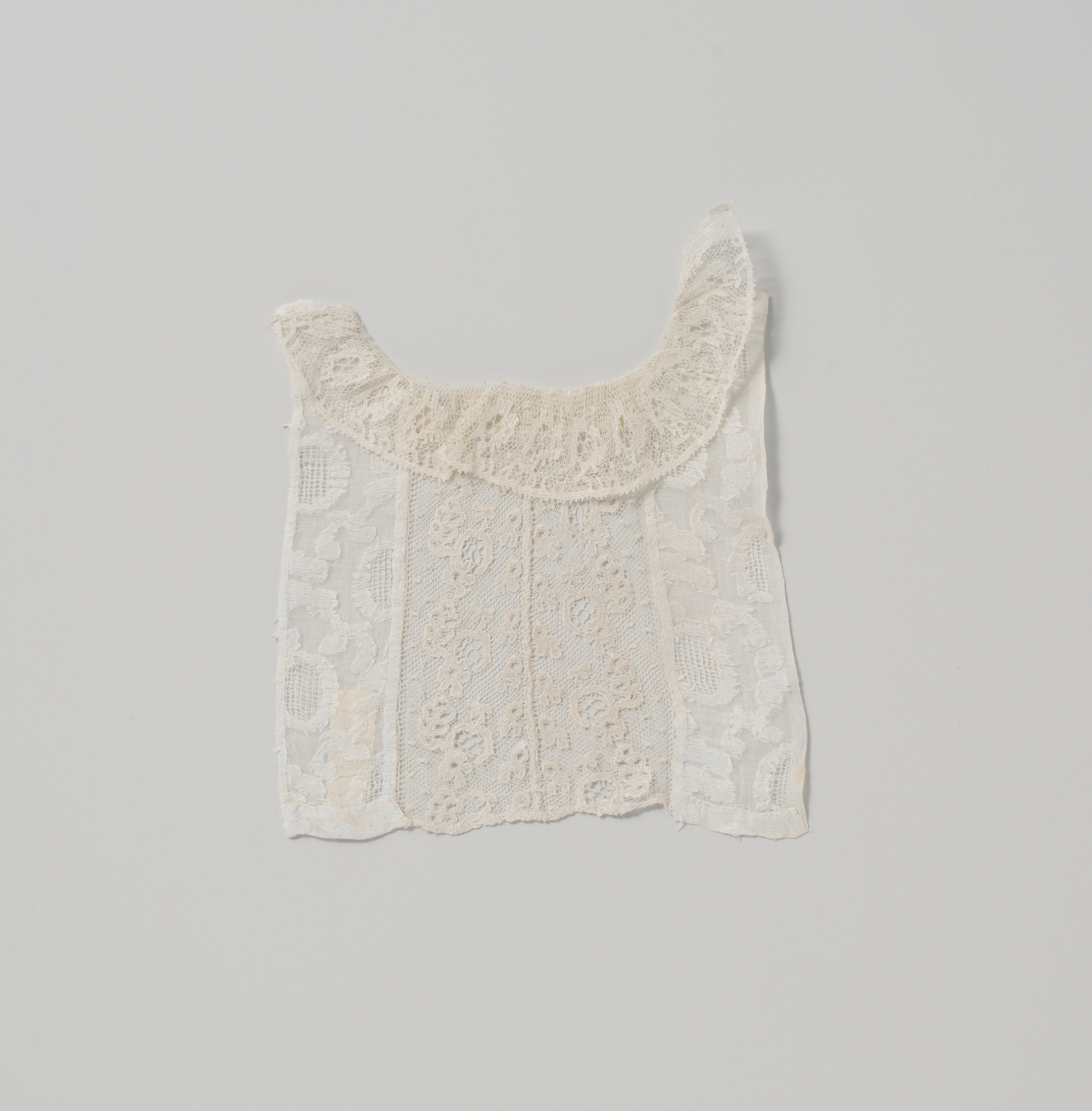 Een zogenoemde voorspelder of befje, gedragen door een baby uit Bunschoten gedurende de weken dat het kind ingebakerd werd. De voorspelder werd onder de hals over het jak gespeld. In het midden zijn twee aan elkaar gezette verticale stroken Rijselse kloskant aangebracht. Deze zijn met de picotrand tegen elkaar gezet. Links en rechts hiervan zit ...