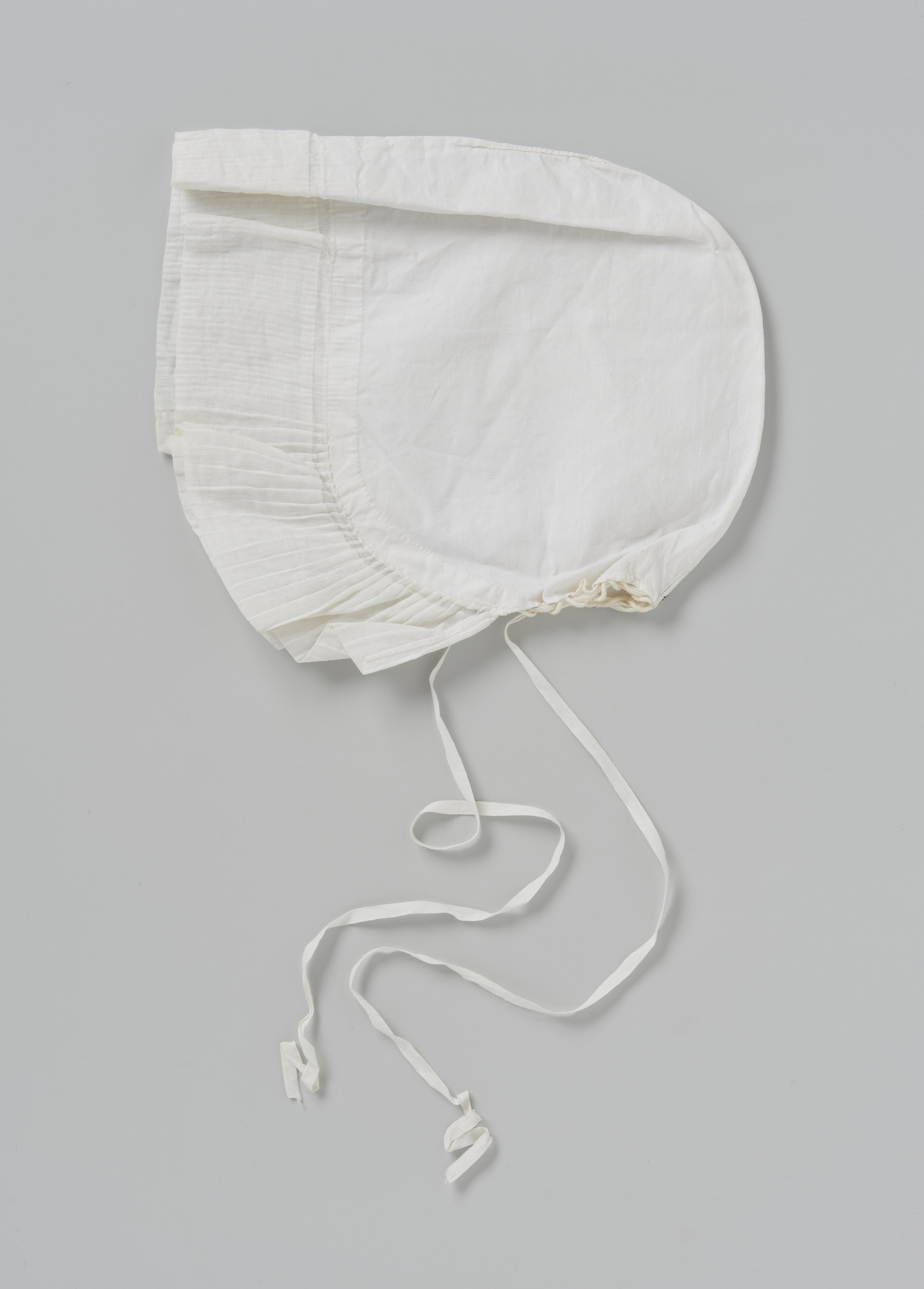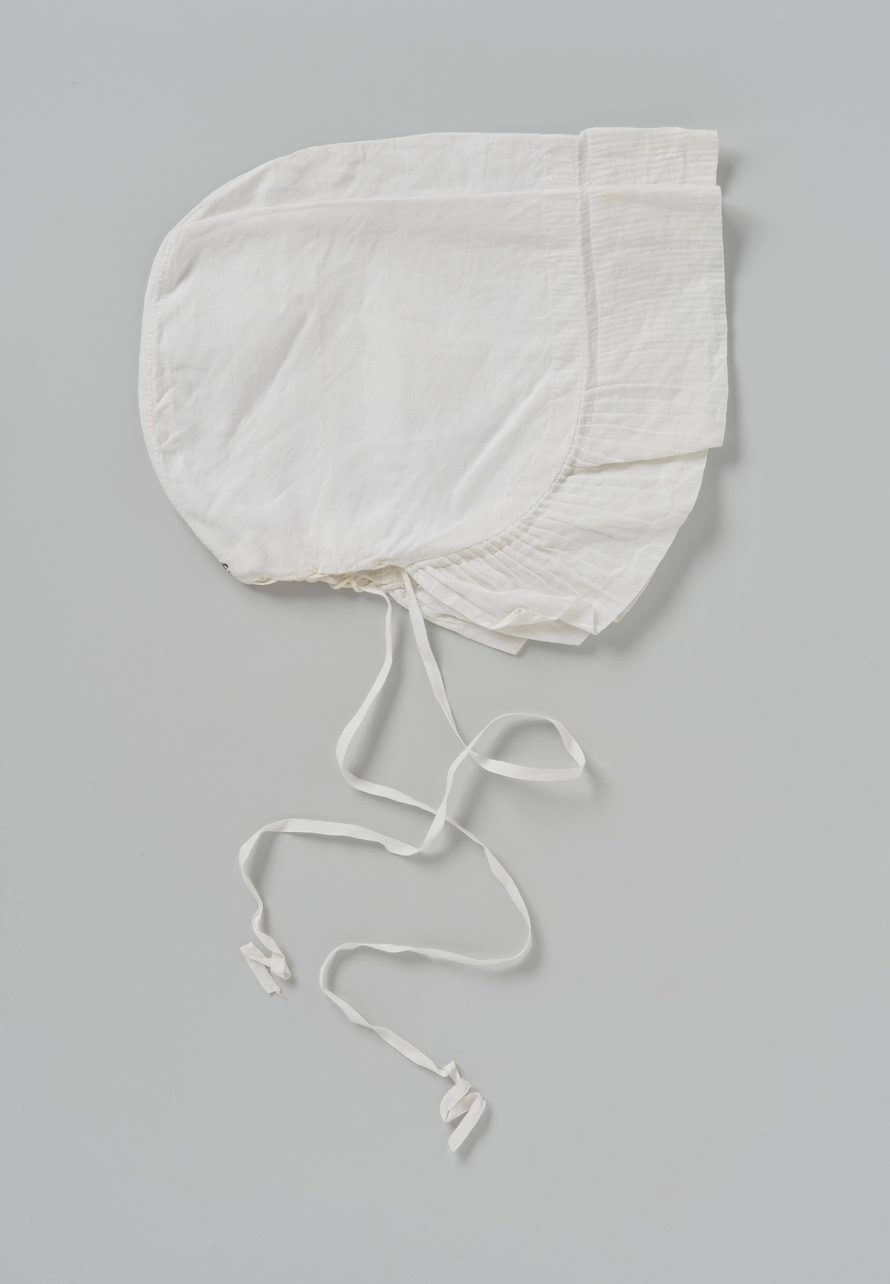 Zogenoemde 'strookte muts', gedragen door een vrouw of meisje uit Bunschoten of Spakenburg bij de zware rouw. Een strookte muts werd tevens gedragen naar een begrafenis. De bol is van effen linnen of katoen. De voorstrook is van 'strookt', een soort dichtgeweven batist. Onderaan, rechts van de achternaad, is de letter E (voorletter van de ...