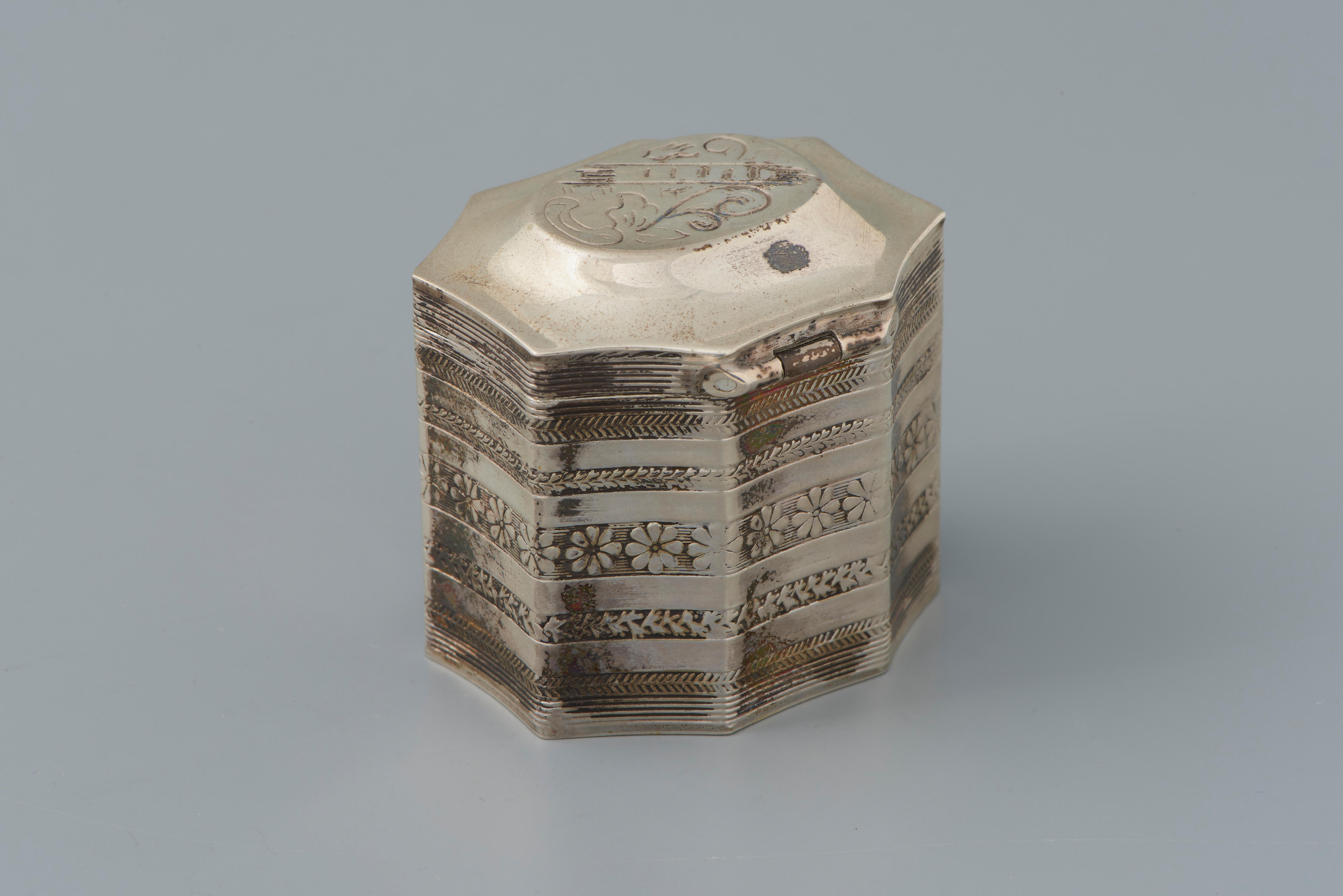 Een zilveren loddereindoosje met een scharnierend oversluitend deksel. In het loddereindoosje zat oorspronkelijk een sponsje. Dit werd gedrenkt in lodderein, een soort reukwater. Lodderein is vergelijkbaar met eau de cologne. Het woord lodderein is een verbastering van het Franse l'eau de la reine (koninginnenwater). Het loddereindoosje is vervaardigd in 1979 naar een ouder model. Het ...