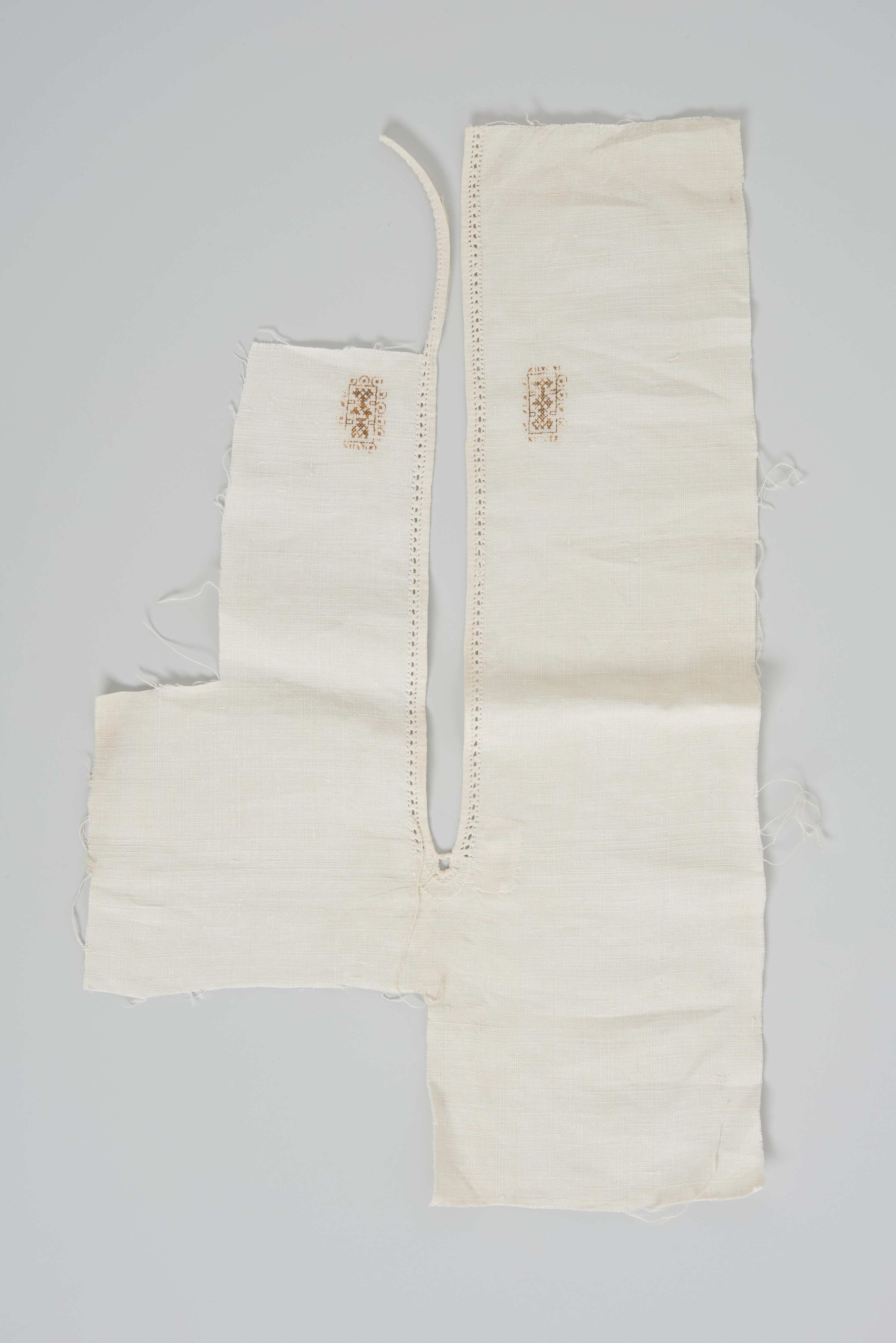 Fragment van een linnen mannenhemd. Het hemd is gedragen door een man uit Friesland. Aan beide zijden van de split is de letter I geborduurd.