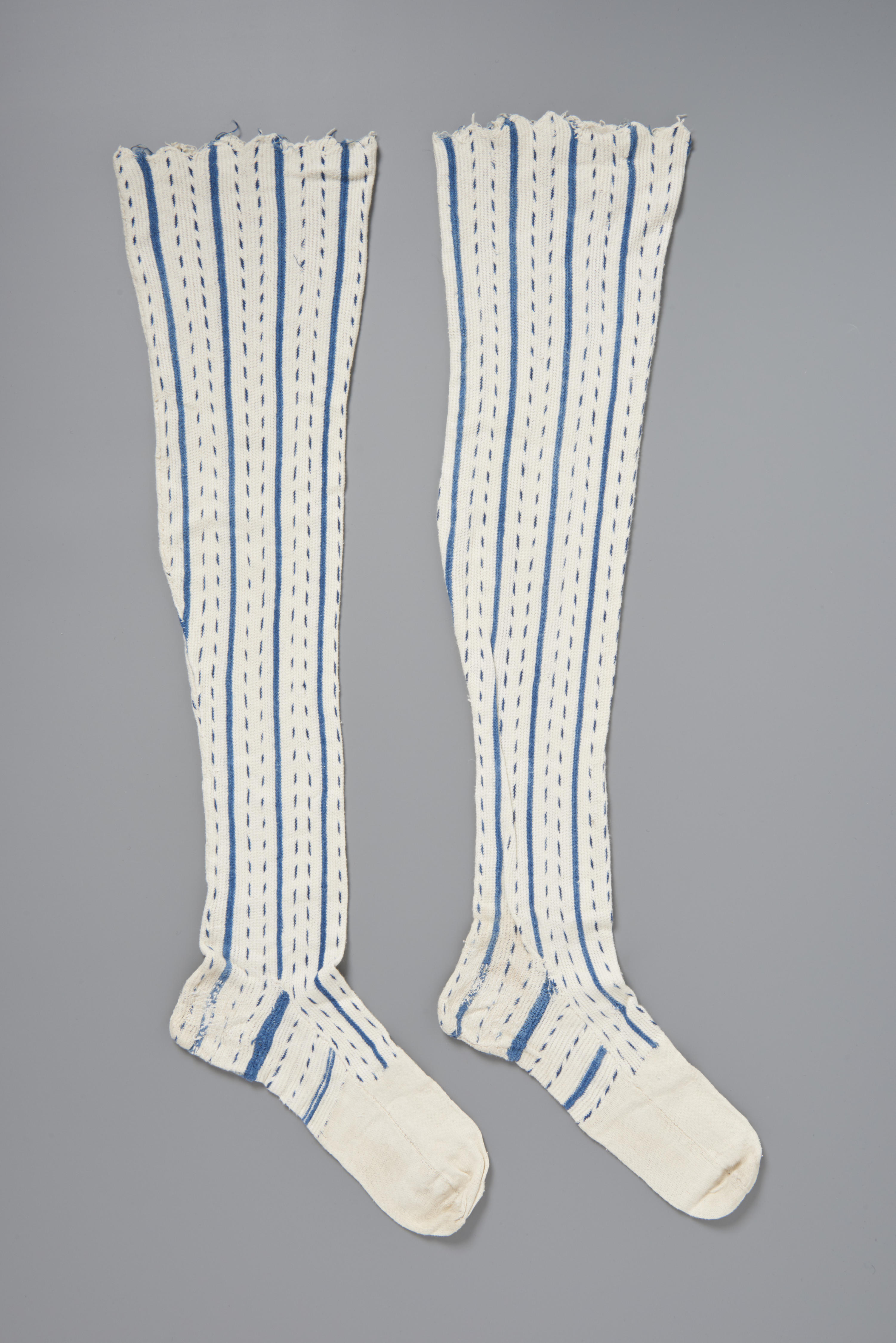 Een paar witte katoenen kousen met ingebreide blauwe streepmotieven. De kousen zijn rondgebreid in rechte steken en hebben middenachter een ingebreide naad. De kousen zijn in het museum toegeschreven aan West-Friesland en de Zaanstreek. De kousen hebben een lengte van circa 76 centimeter.