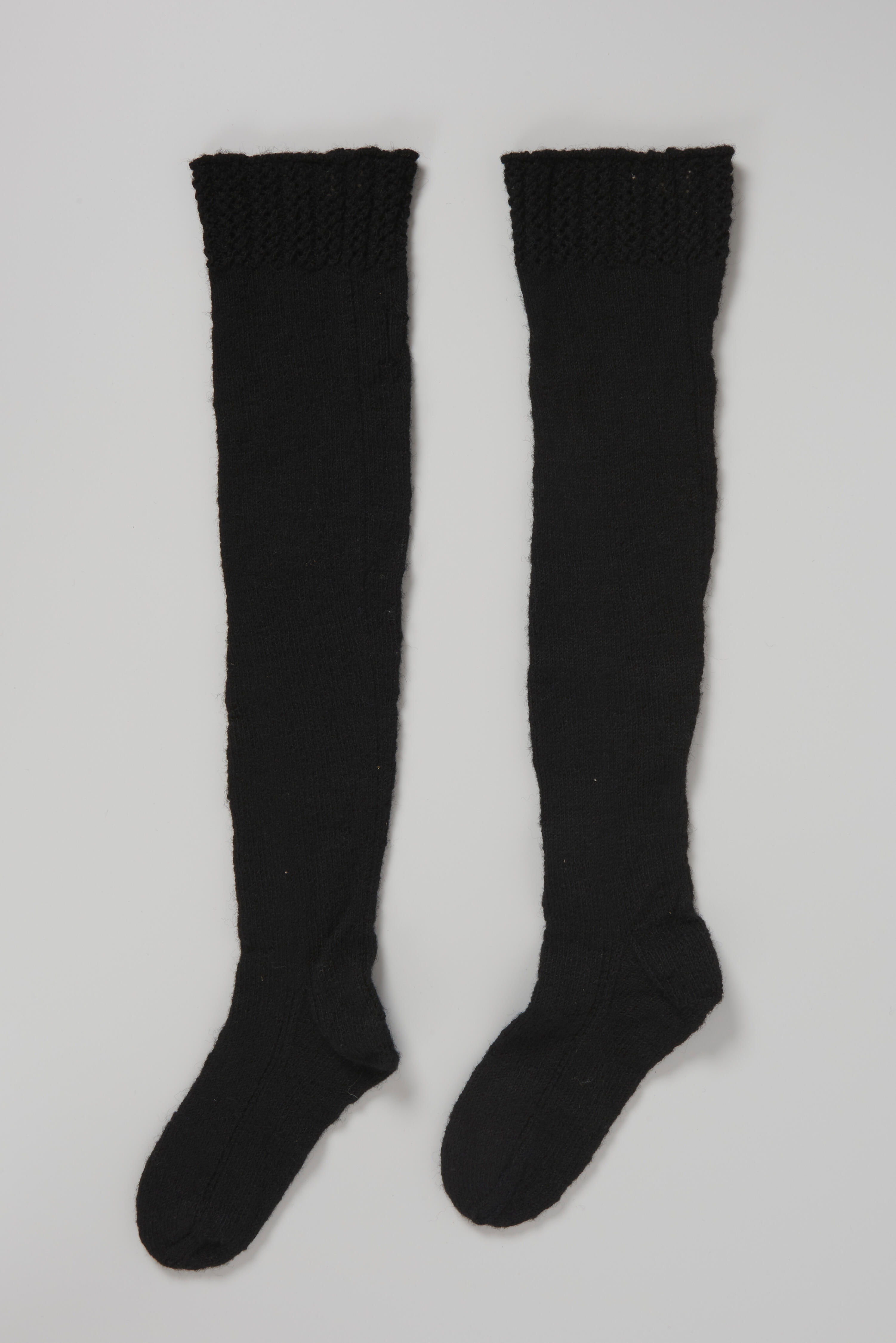 Een paar zwarte wollen kousen, gedragen door een vrouw uit Drenthe. De kousen zijn rondgebreid in rechte steken. De kousen hebben aan de bovenzijde een circa 6 centimeter brede boord, gebreid in een ajoursteek. Middenachter is een verticale naad ingebreid van averechte steken. Onder de boord is het initiaal of cijfer I ingebreid. De totale ...