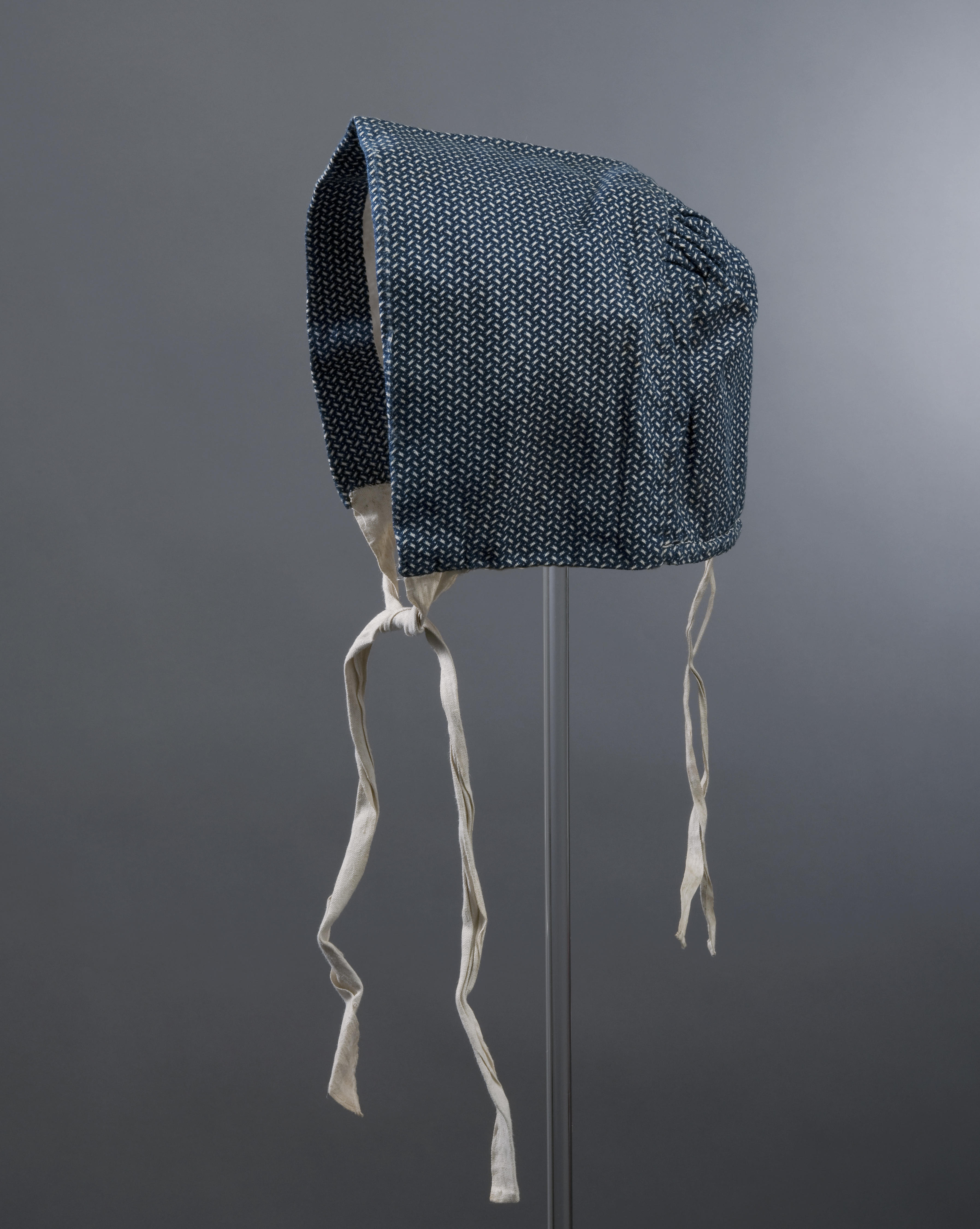 Daagse muts van gedessineerde keperkatoen met een tegenvoering van naturelkleurig, vrij grof linnen. De voering van de pas is van fijner linnen. De muts is afkomstig van Texel.