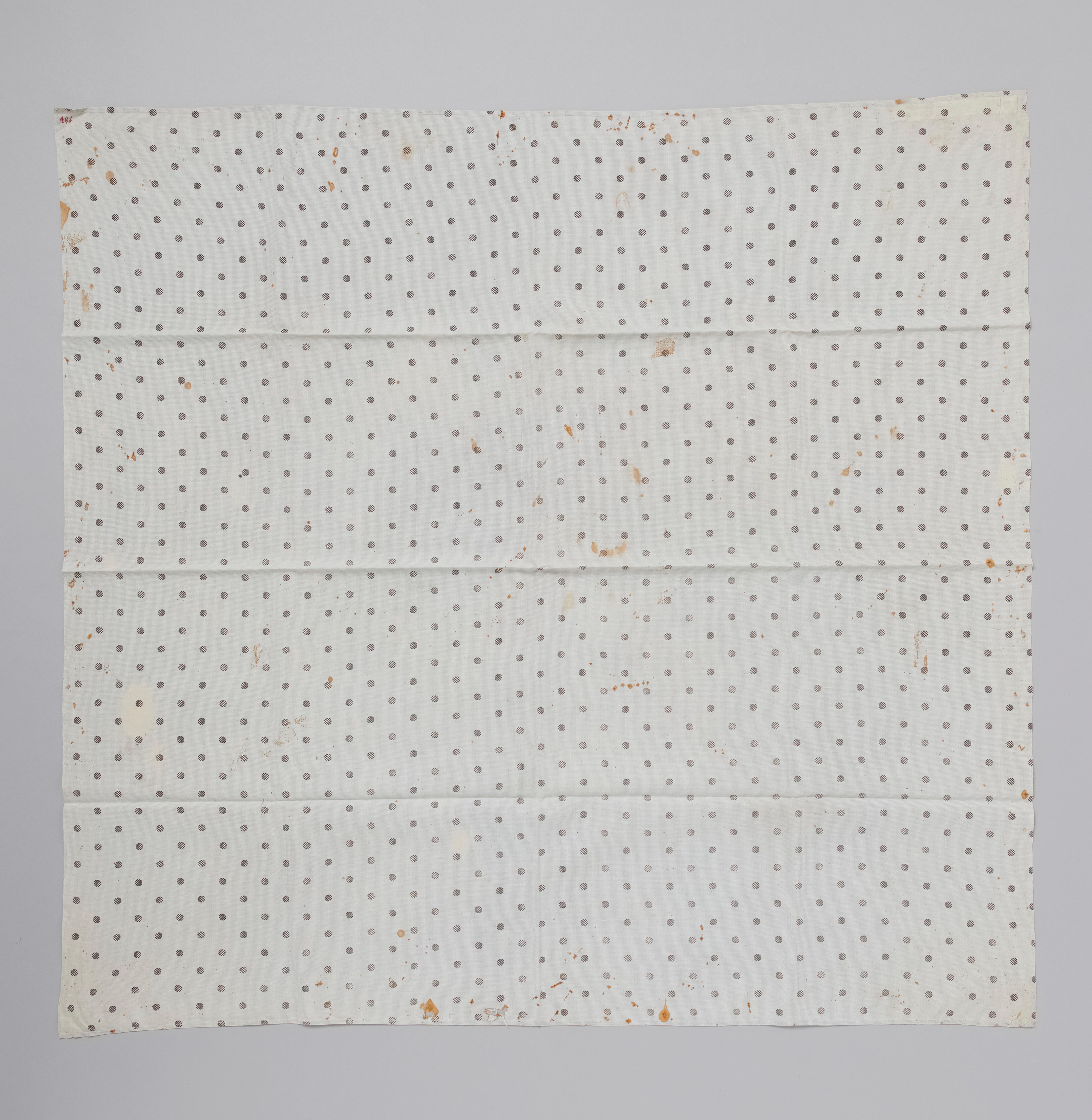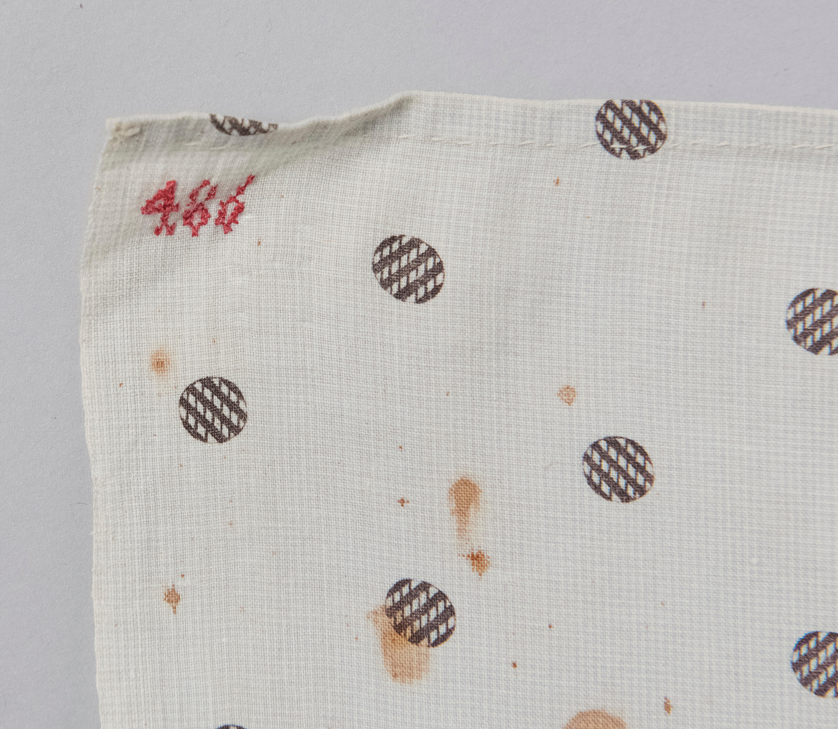 Gedessineerde katoenen doek, gebruikt in Volendam voor het verpakken van een set doopkleding. In een van de hoeken is met rood garen het nummer 486 geborduurd.