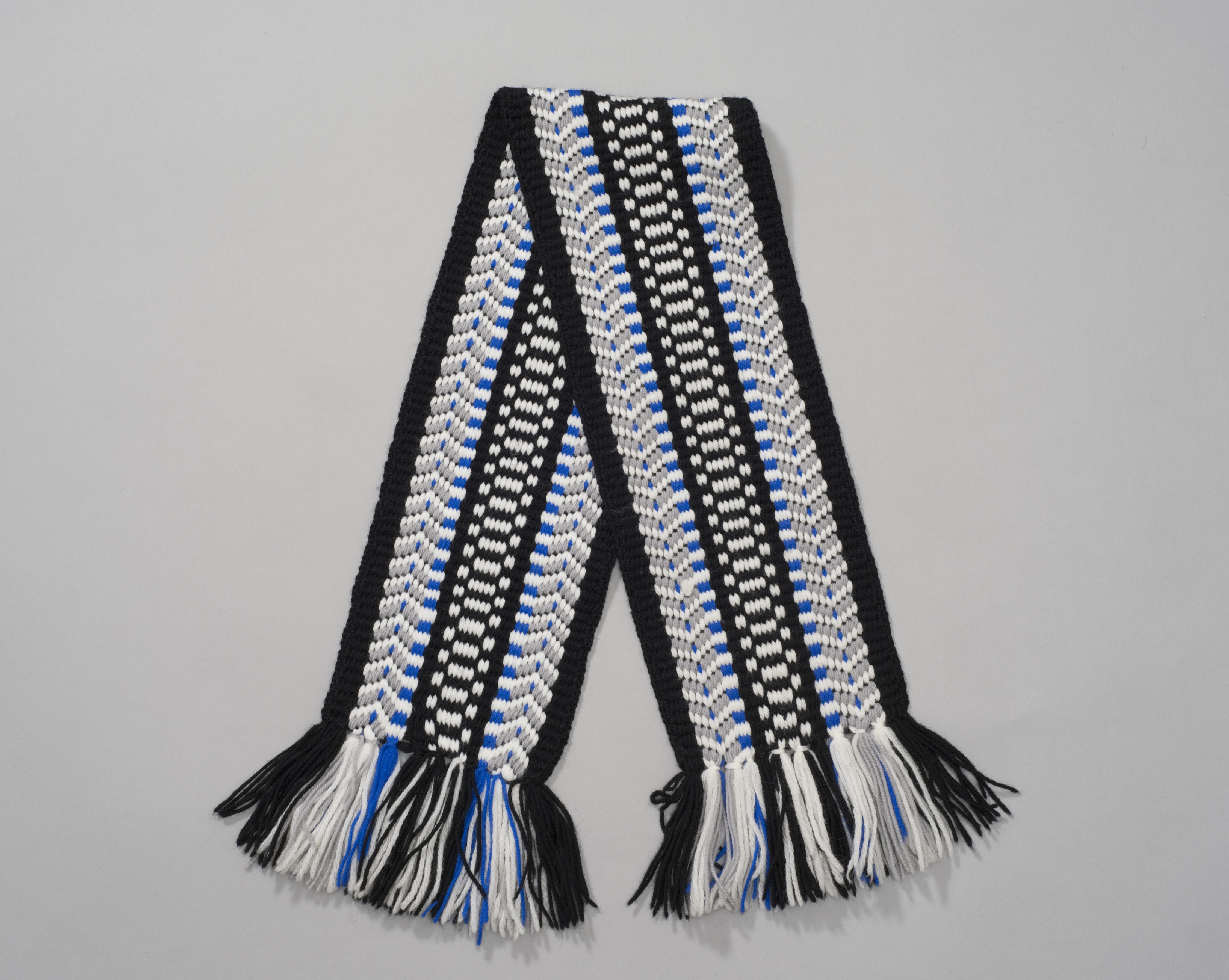 Geweven wollen vrouwendasje voor de rouw, afkomstig uit Volendam. Deze dasjes worden geweven of gevlochten op een plank met spijkertjes aan weerszijden.