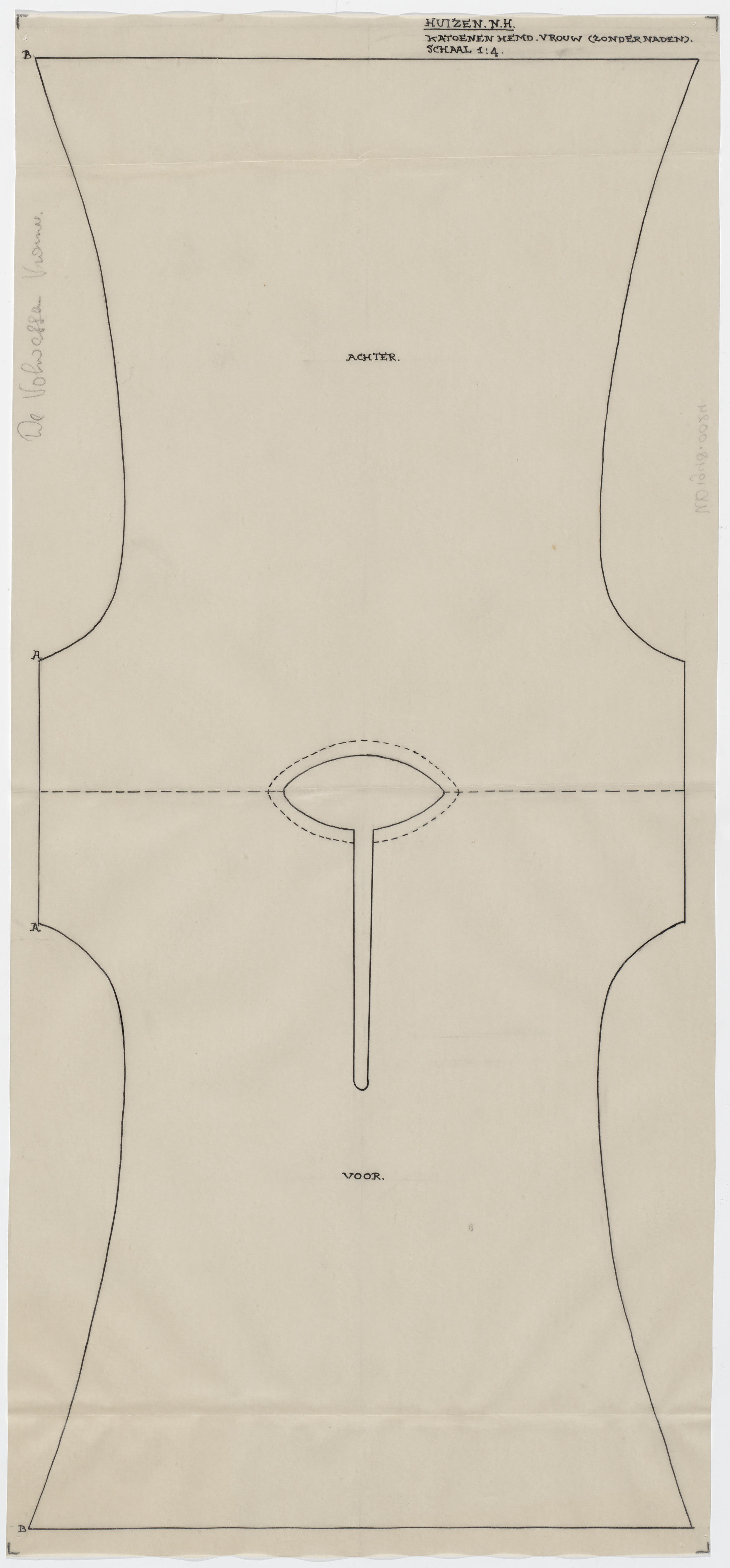 Patroontekening van een katoenen hemd, gedragen door een vrouw. Schaal 1:4.