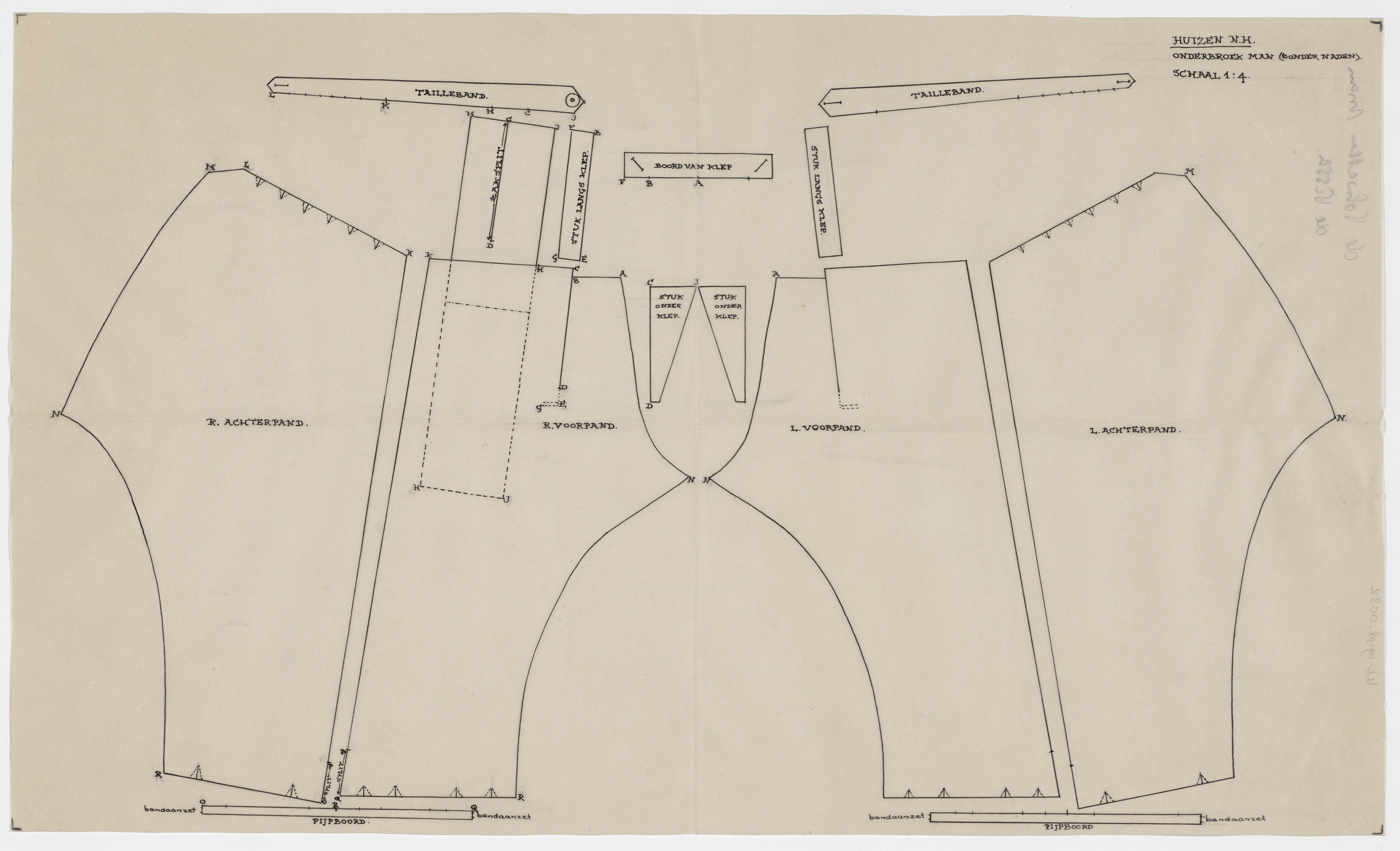 Patroontekening van een mannenonderbroek. Schaal 1:4.